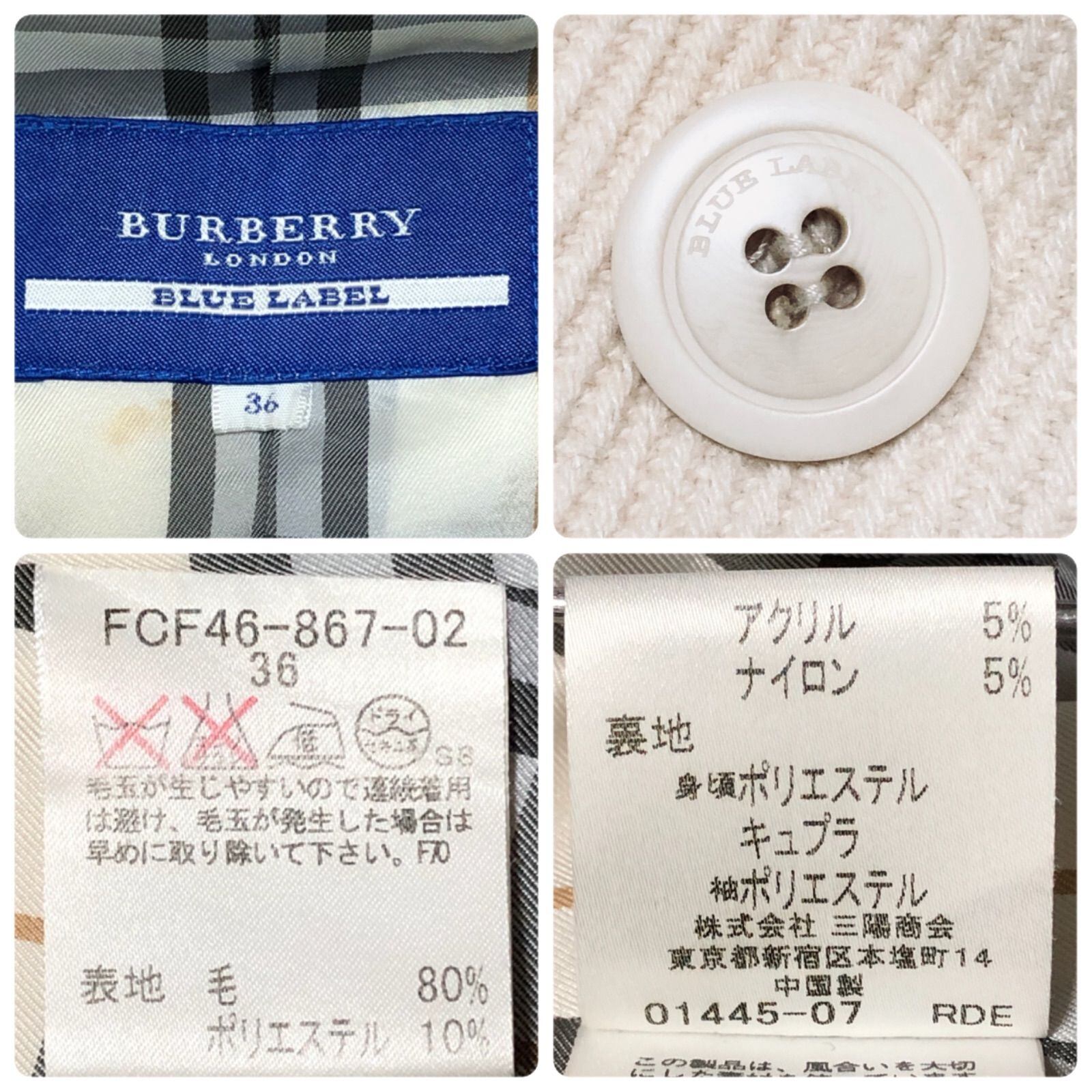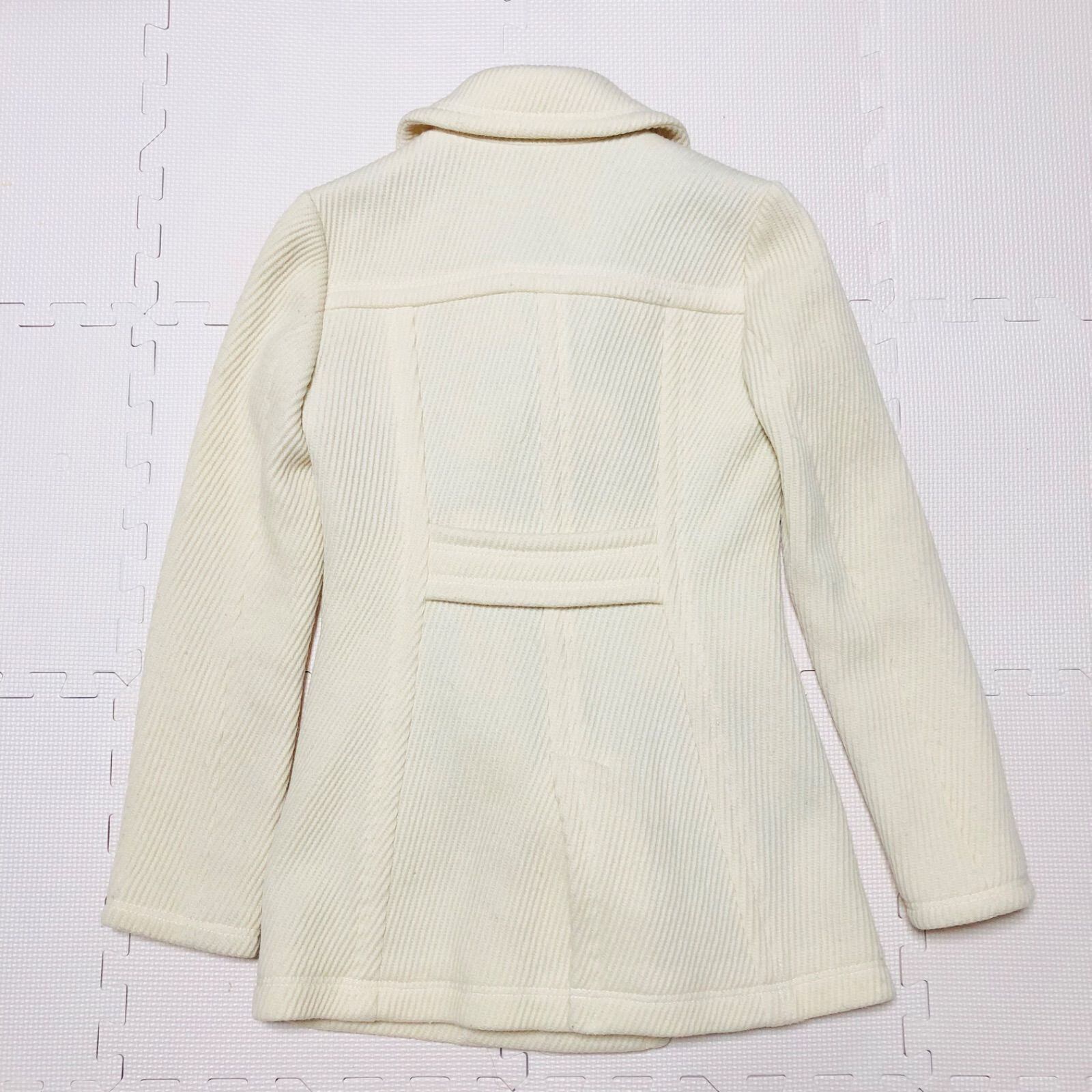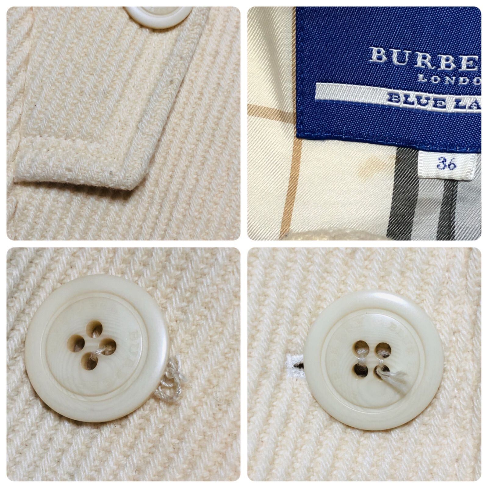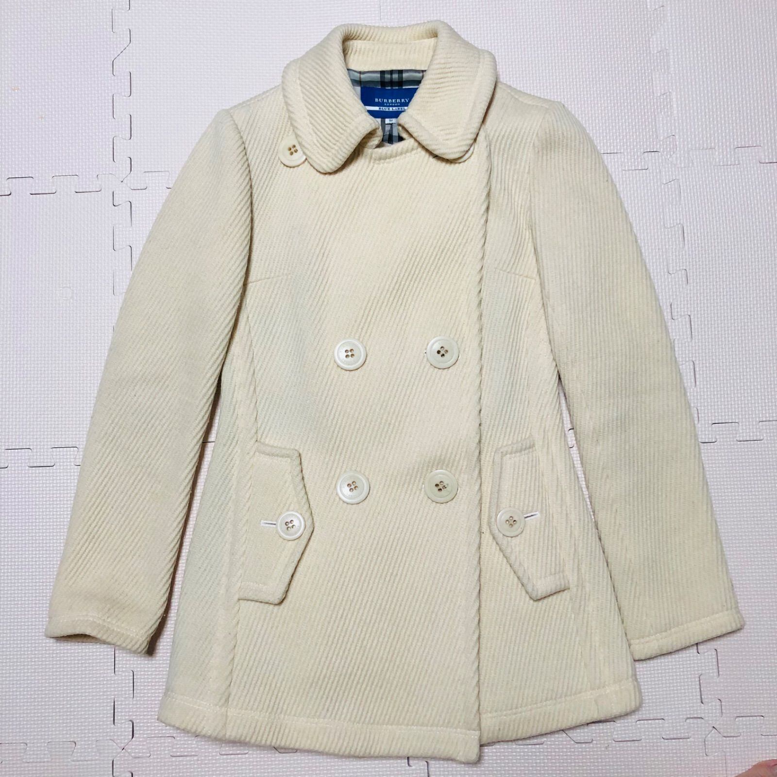 ■美品■BURBERRY BLUE LABEL バーバリーブルーレーベル Pコート ピーコート ウール80% 女優襟 裏地フルノバチェック size36(S) ホワイト系アイボリー 三陽商会 レディース