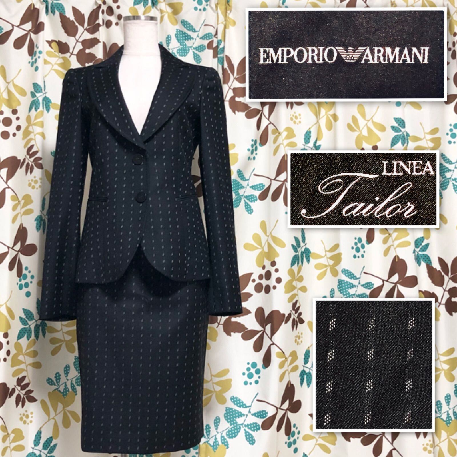 ■極美品■EMPORIO ARMANI エンポリオアルマーニ LINEA Taulor セットアップ スカートスーツ ウール size40 /38 イタリア製 菱形ドット シャドーストライプ シングル2つボタン ひざ丈タイトスカート ブラック レディース