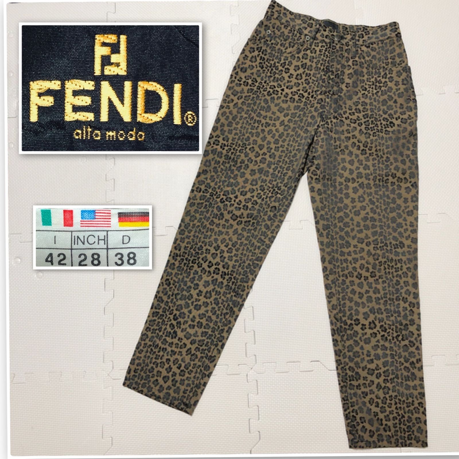 ■美品■FENDI フェンディ ロングパンツ レオパード柄 ヒョウ柄 ロゴボタン size42(L程度) イタリア製 ブラウン系 コットン混ポリエステル レディース ラグジュアリー 派手