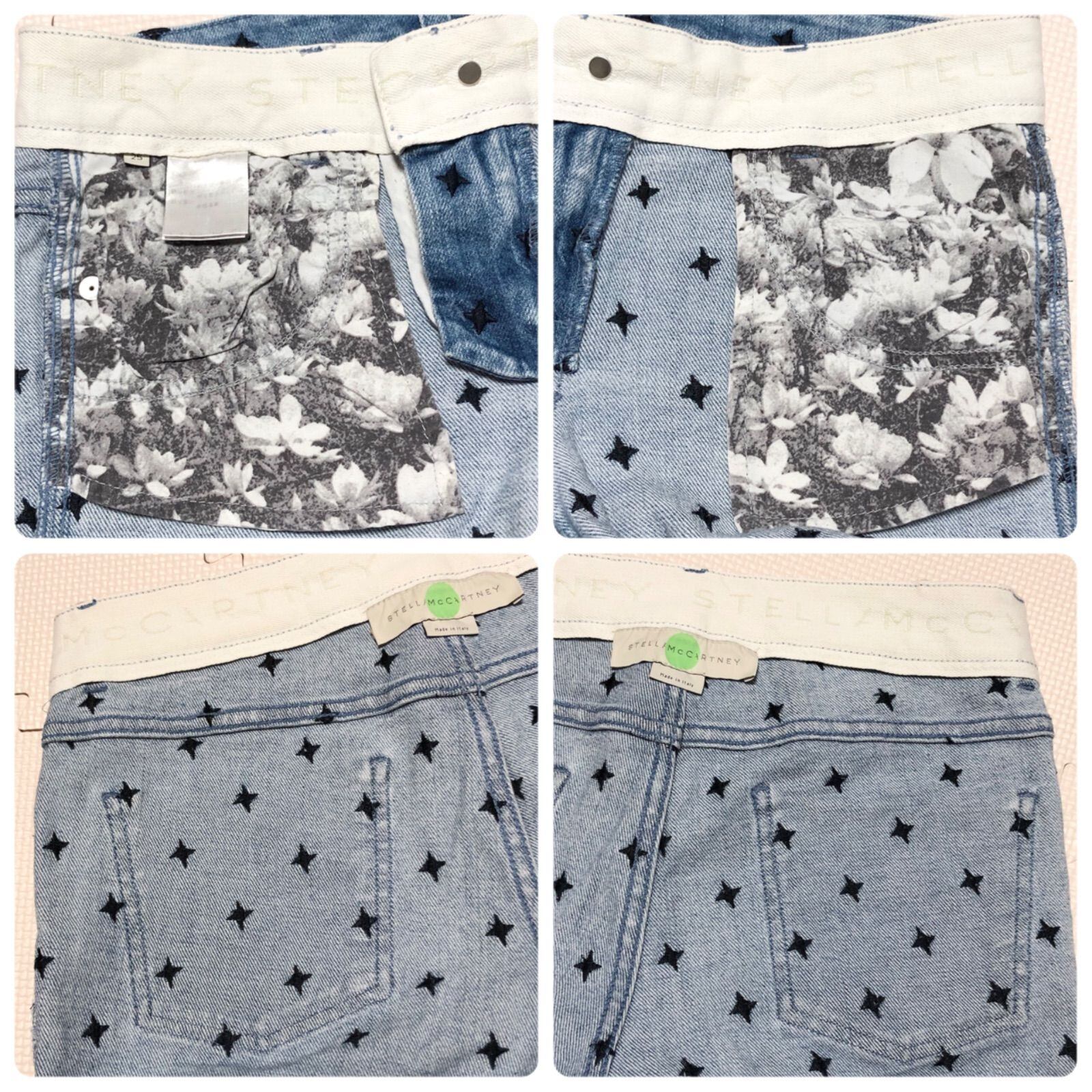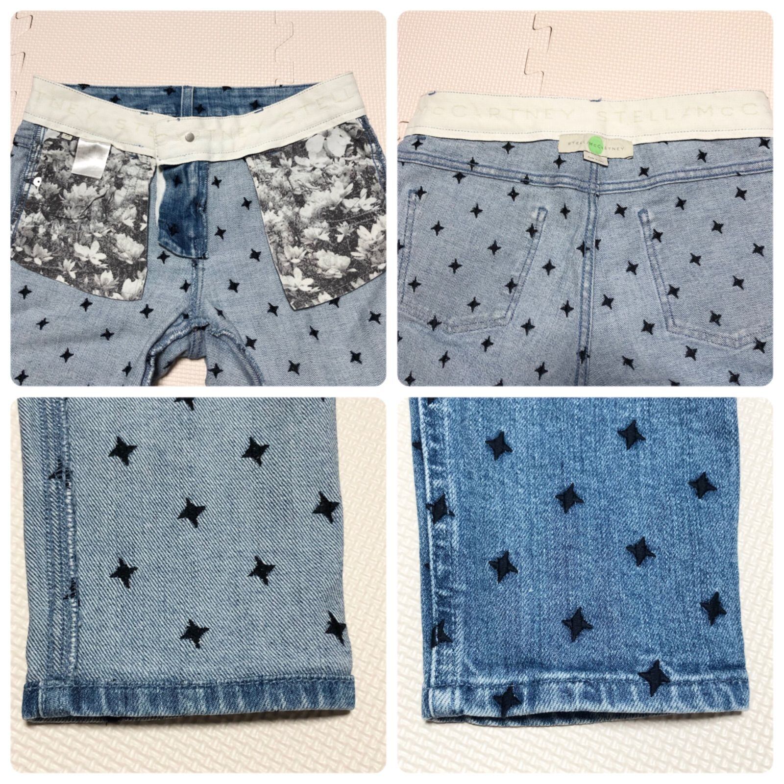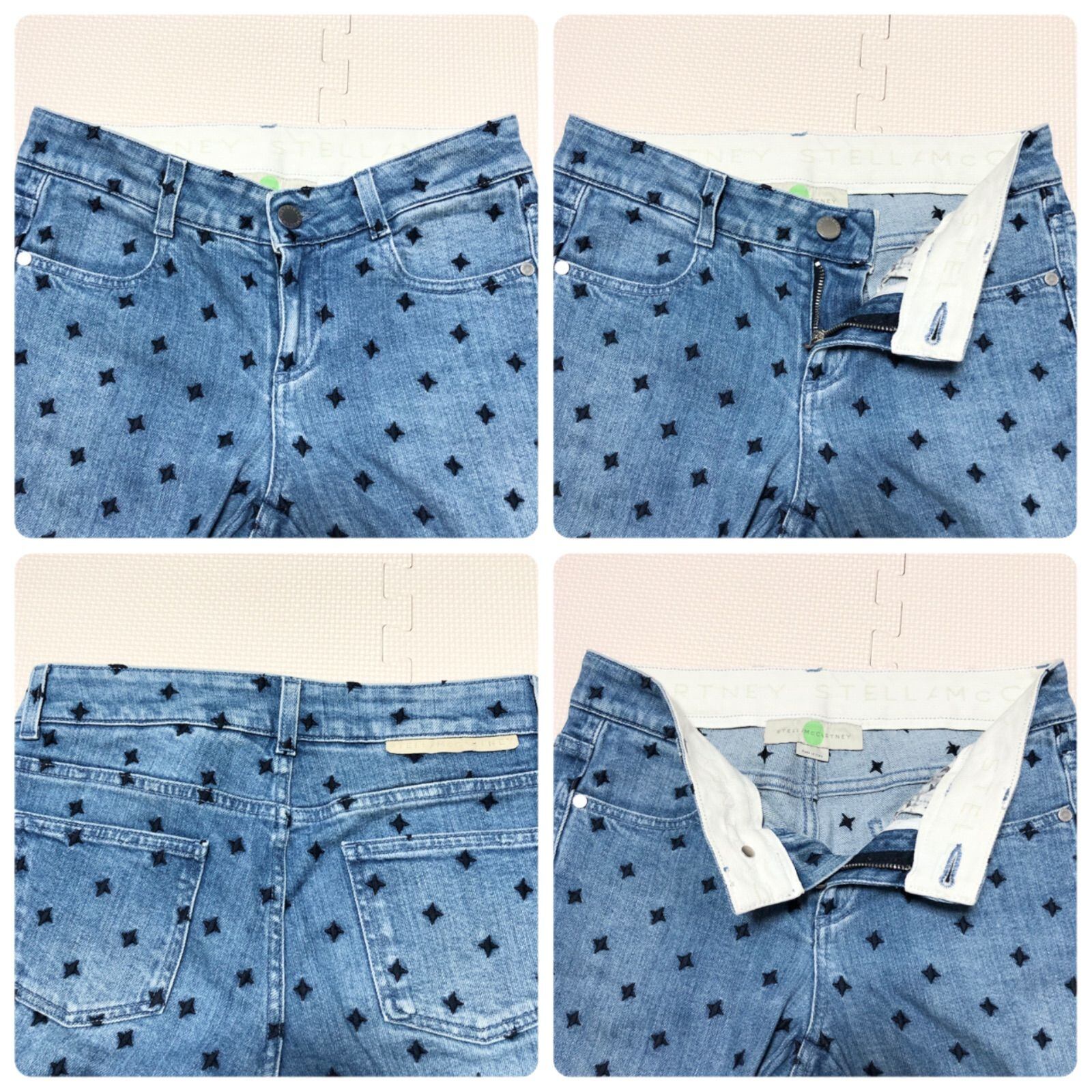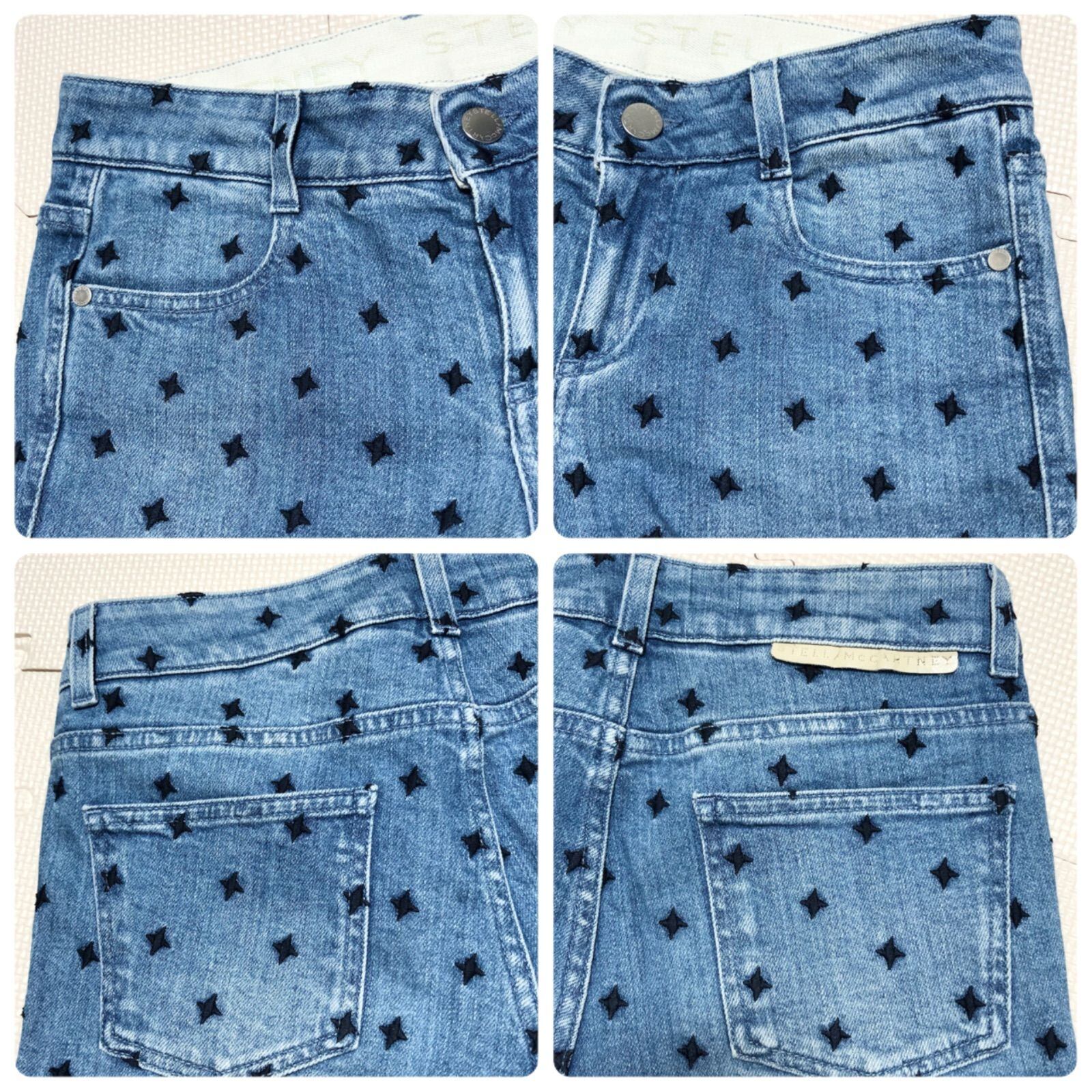 ■美品■ Stella McCartney ステラマッカートニー ブラックスター総柄 デニムパンツ 刺繍 size25(S ウエスト幅34cm) イタリア製 インディゴブルー×ブラック コットン ロゴ銀ボタン レディース ラグスト