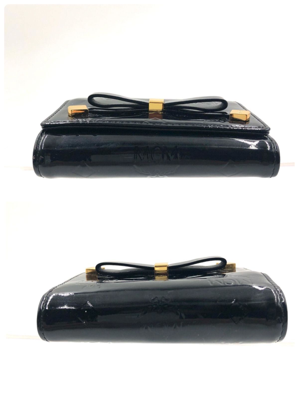 ■極美品■MCM エムシーエム ヴィセトス総柄 三ツ折り財布 エナメル パテントレザー リボンモチーフ ブラック ゴールド金具 パスケース タグあり 韓国ファッション
