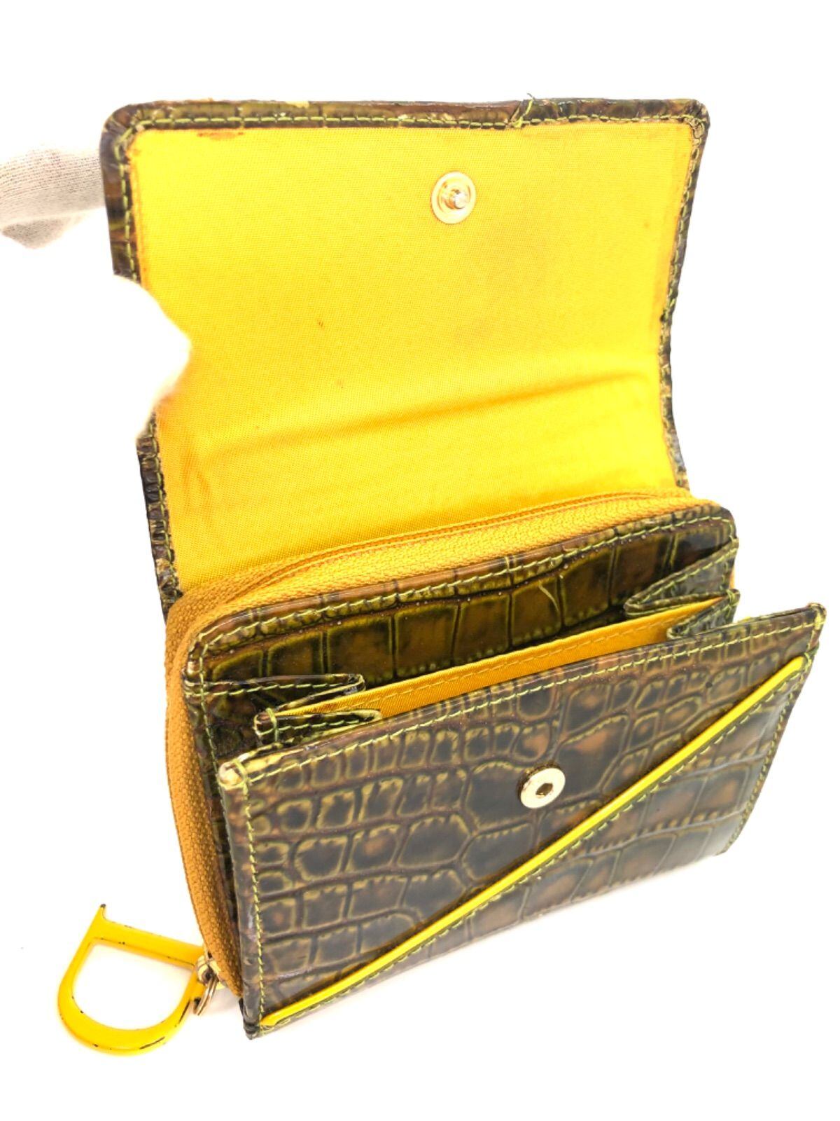■希少■Christian Dior クリスチャンディオール クロコ型押しレザー コインケース 二つ折り財布 D金具 ブラウン×イエロー ゴールド金具 イタリア製 刻印あり レディース