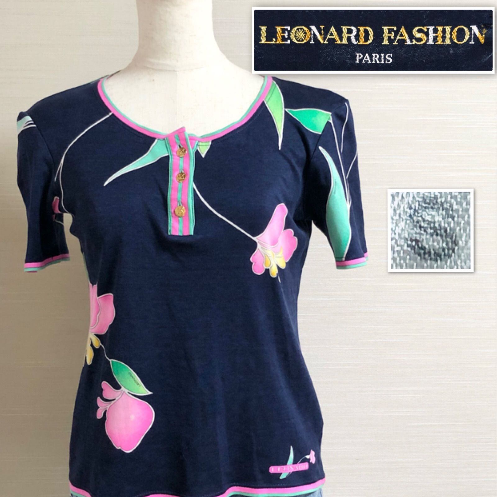 ■美品■LEONARD FASHON レオナールファッション ヘンリーネック Tシャツ 花柄 sizeS(胸囲72~80cm) コットン100% 金ボタン ネイビー×マルチカラー レディース