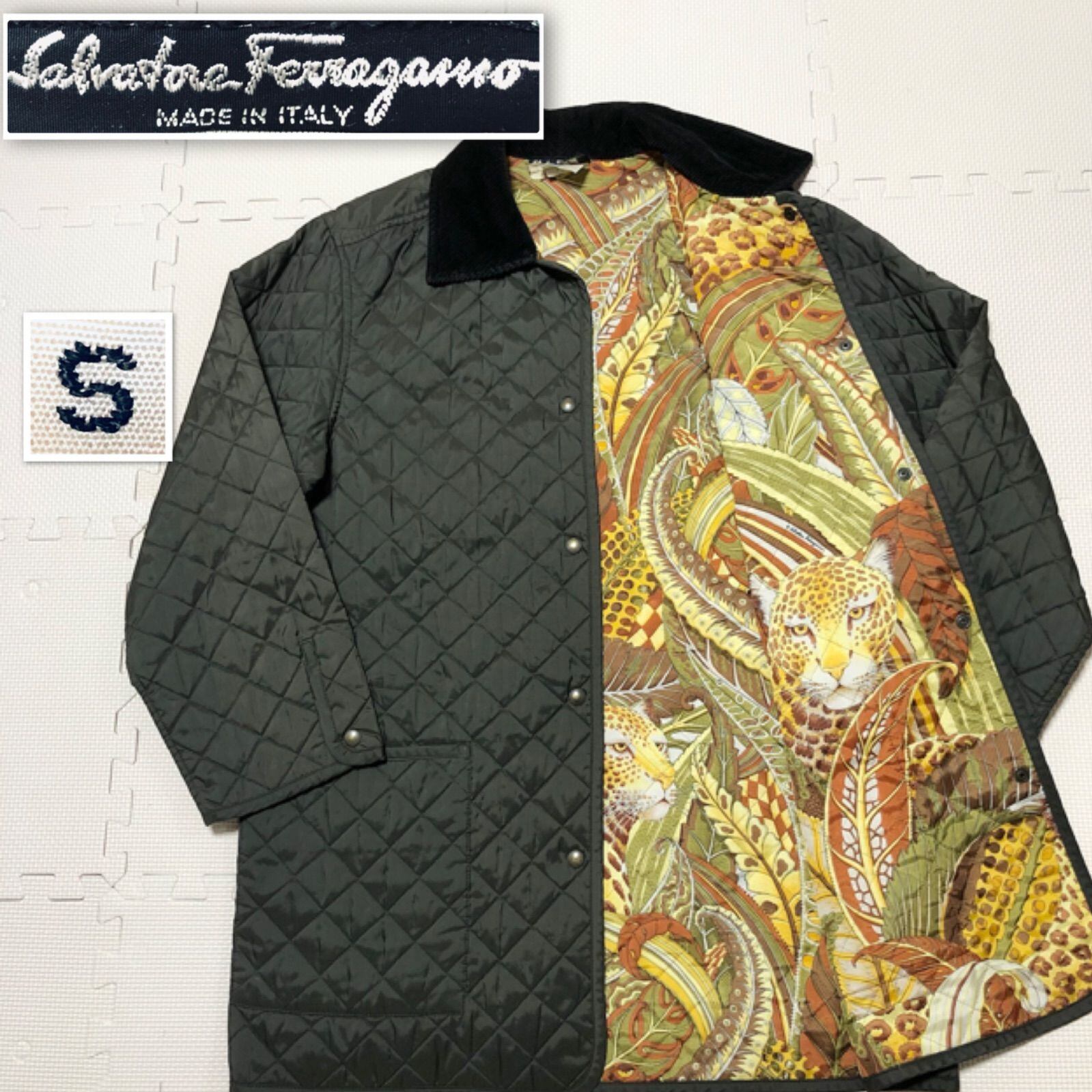 ■美品■希少■Salvatore Ferragamo サルヴァトーレフェラガモ キルティングジャケット コート 裏地レオパード ヒョウ柄 アニマル 密林 sizeS(実寸はかなり大きめです。Lに近いと思います) イタリア製 グリーン系 レディース 派手