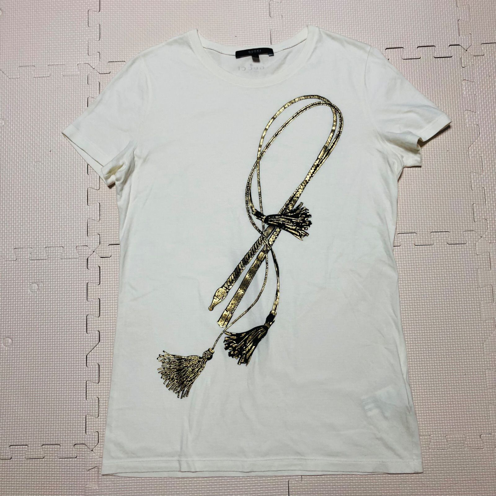■極美品■GUCCI グッチ Tシャツ 半袖 バラ鞭 ムチ 前面ワンポイント 金ラメ size L イタリア製 コットン100% タグあり ホワイト×ブラック×ゴールド レディース