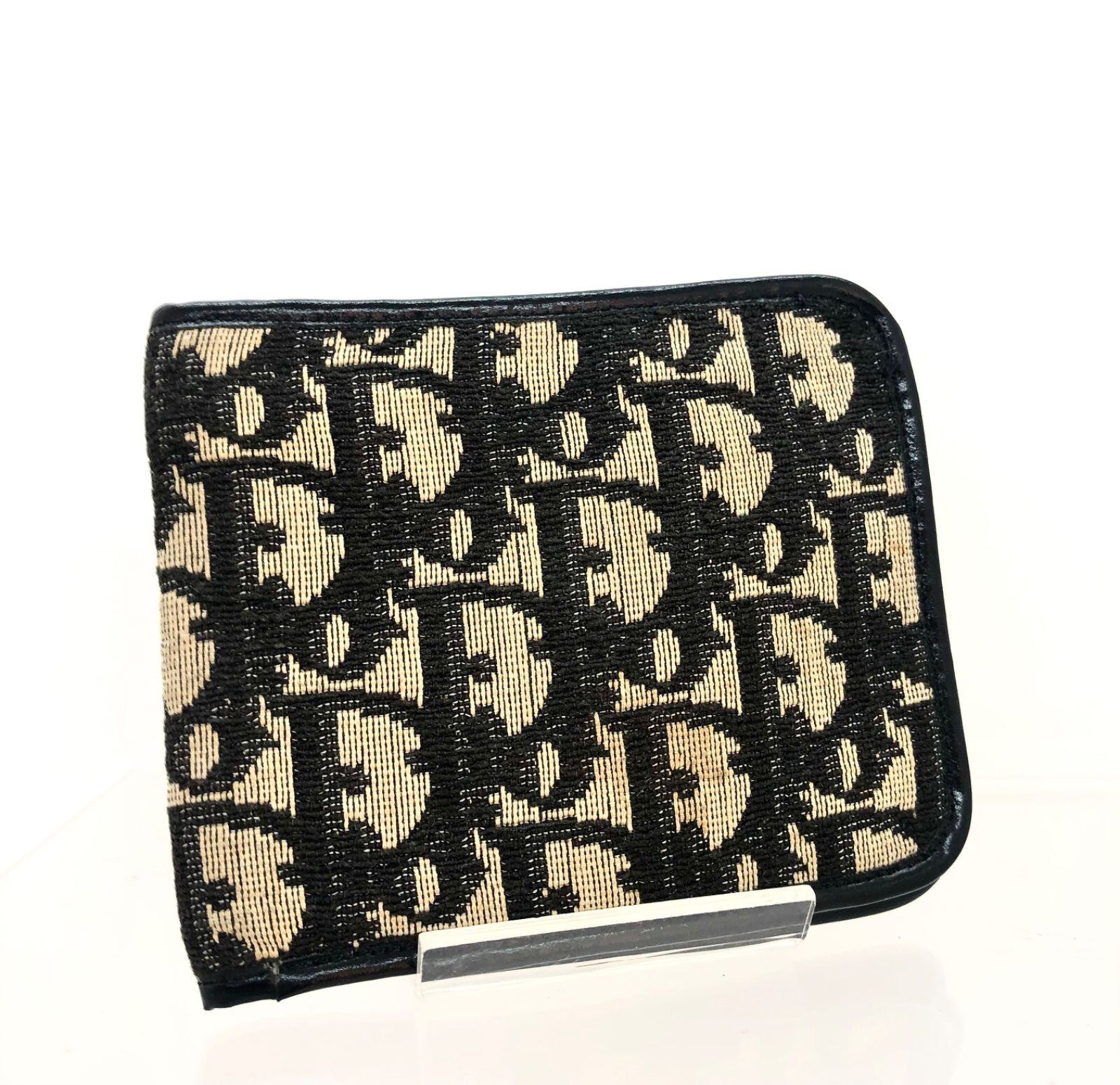 ■希少1990年代 初期ヴィンテージ・同型最初期モデル■Christian Dior クリスチャンディオール トロッター 二つ折り財布 ミニウォレット フランス製 キャンバス×レザー ロゴ総柄 ベージュ×ブラック ゴールド金具 レディース