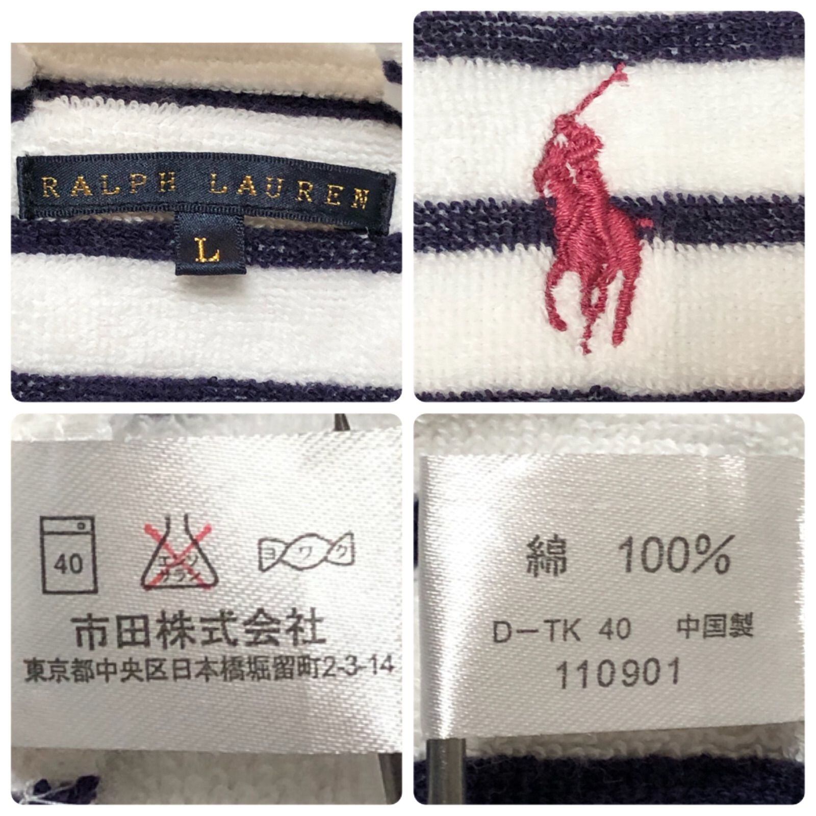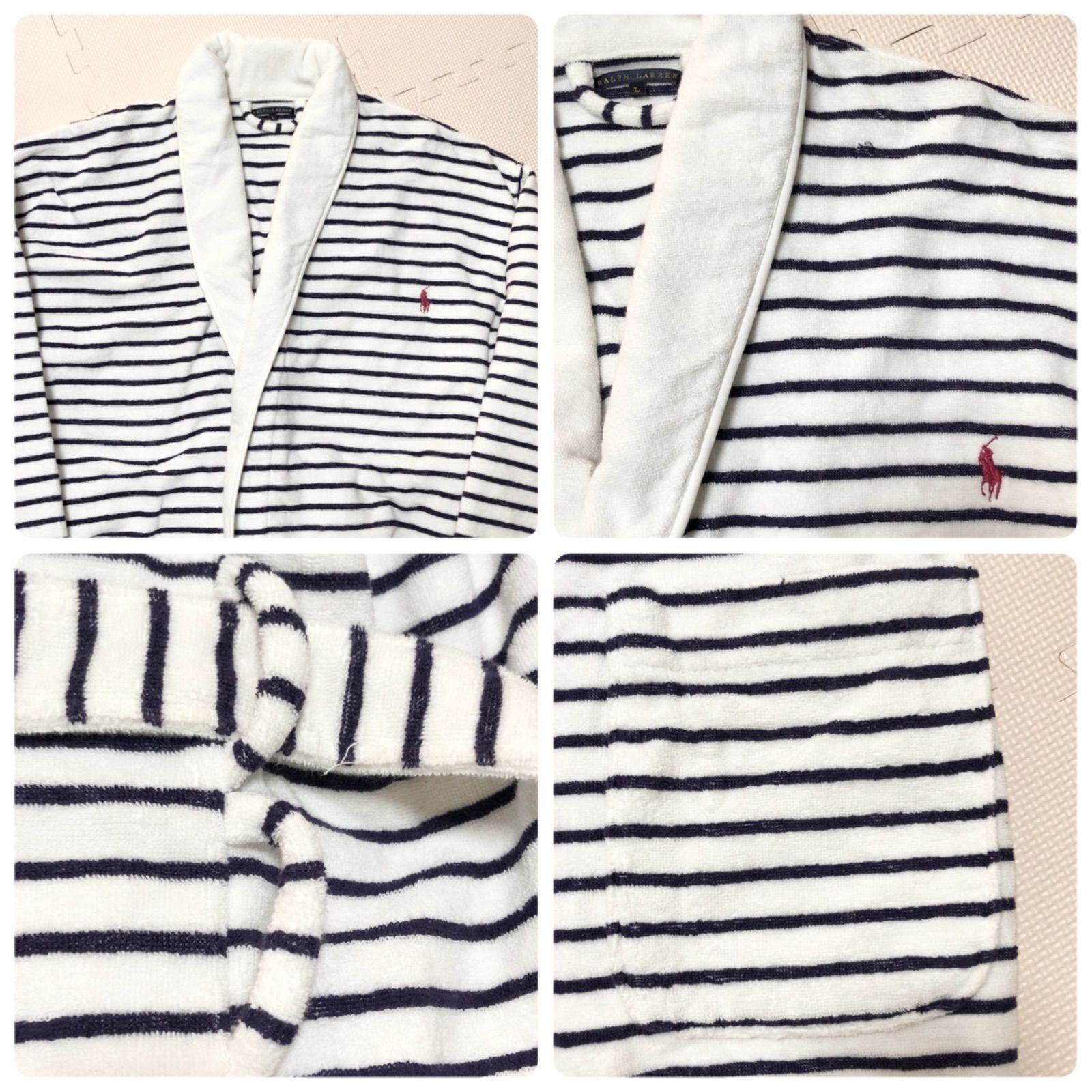 ■希少■Ralph Lauren ラルフローレン ガウン バスローブ ポニー刺しゅう ボーダー柄 sizeL ベルト紐 メンズ ホワイト×ネイビー コットン100% 市田株式会社製