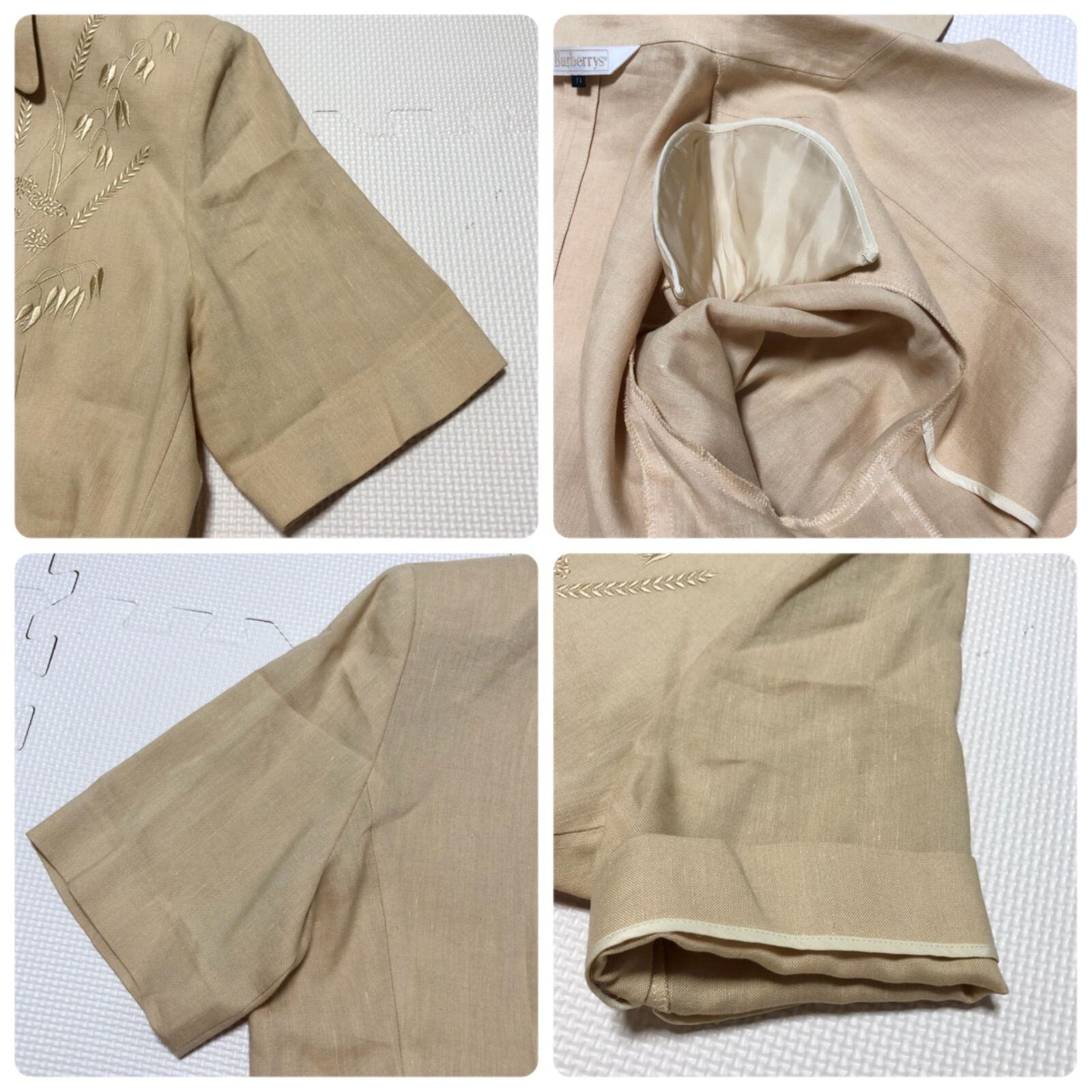 ■極美品■Burberrys バーバリー 植物柄刺しゅう セットアップスカートスーツ 半袖ジャケット リネン&レーヨン size11R/ 11AR(サイズM~L相当) サマースーツ 夏 ベージュ レディース