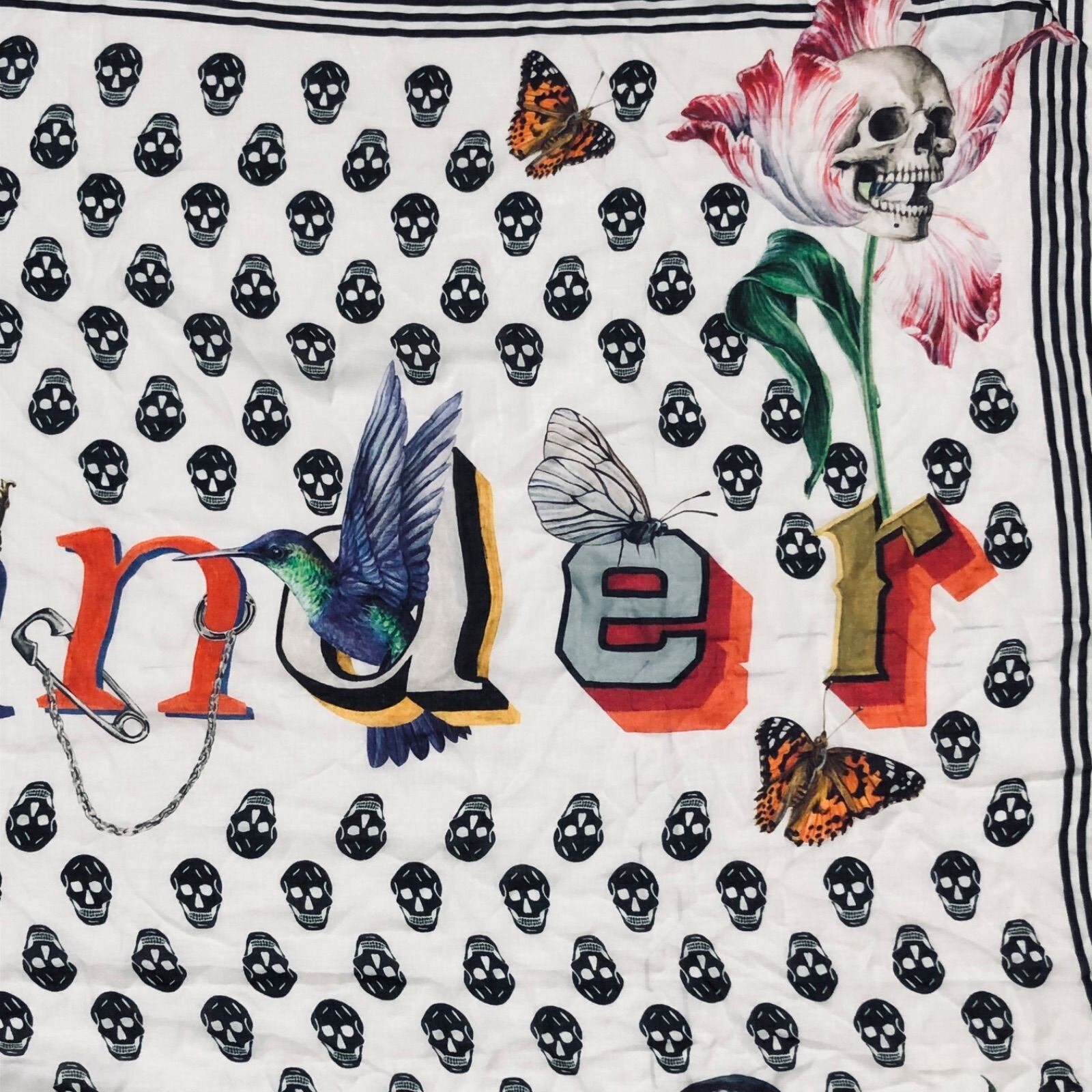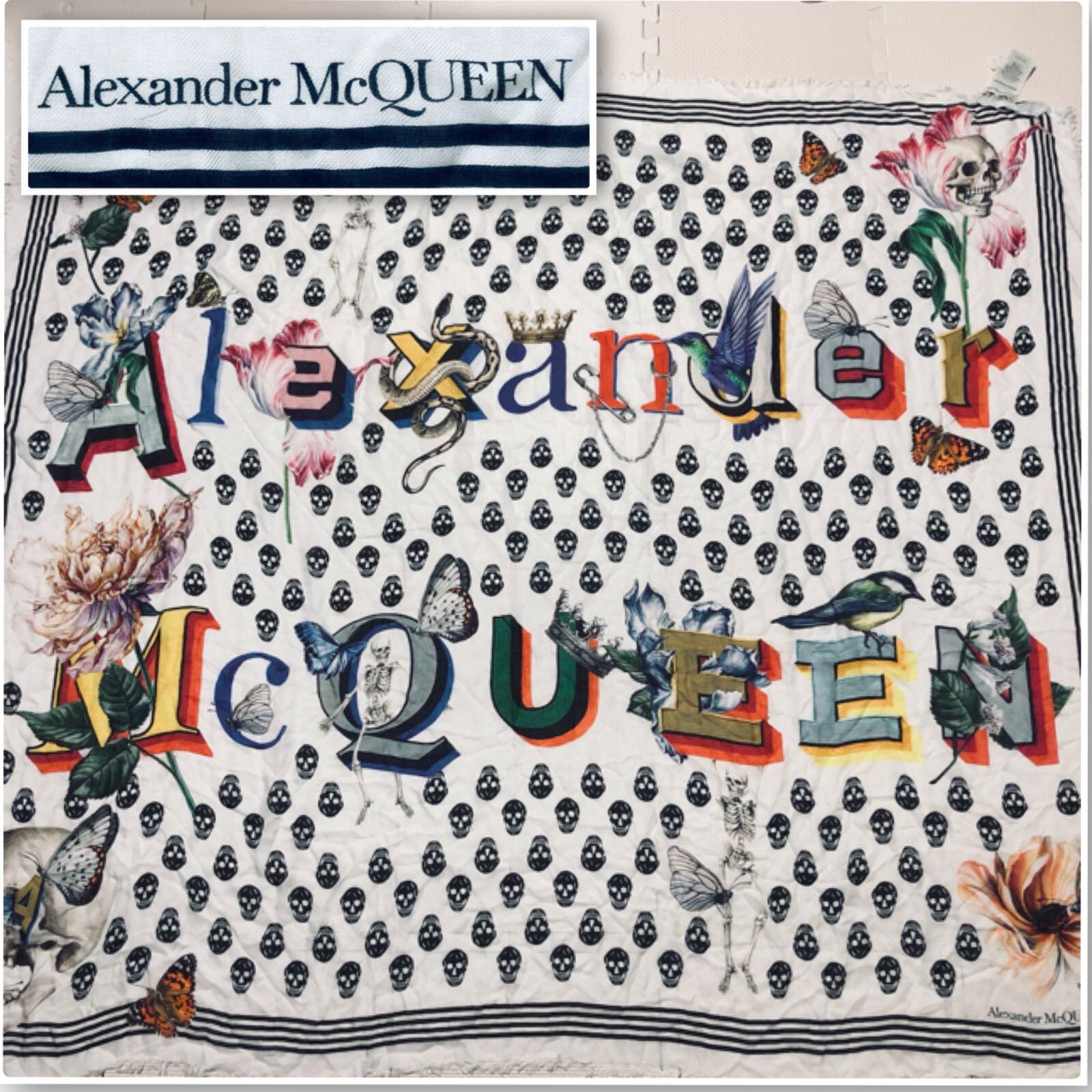 ■希少■Alexander McQueen アレキサンダーマックイーン 大判ストール ビッグロゴ スカル ドクロ 総柄 イタリア製 アイボリー×マルチカラー 120×140cm