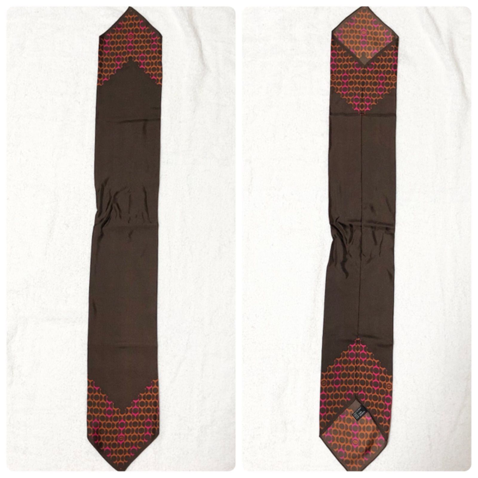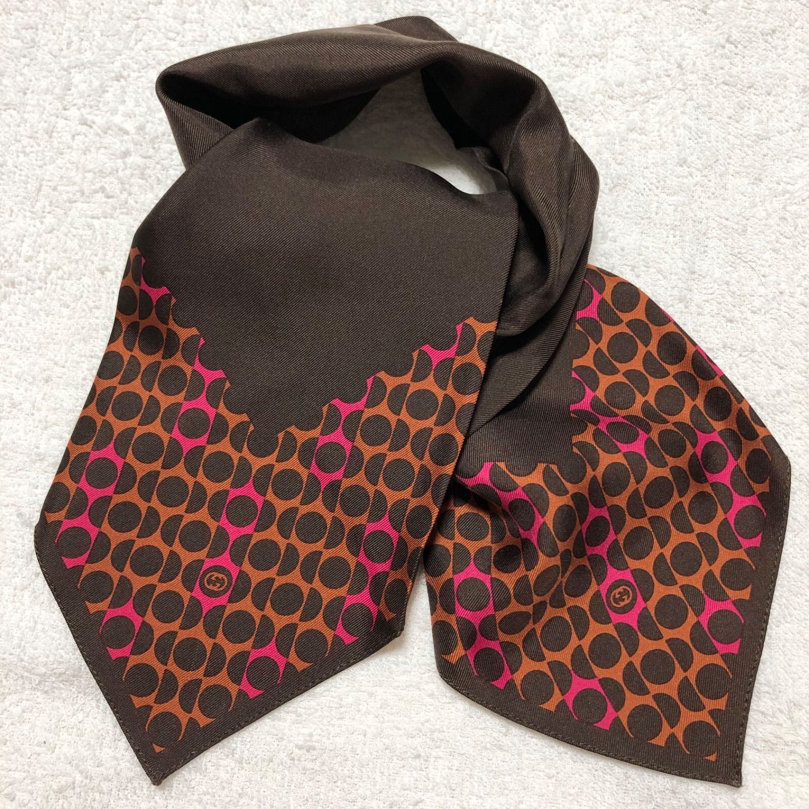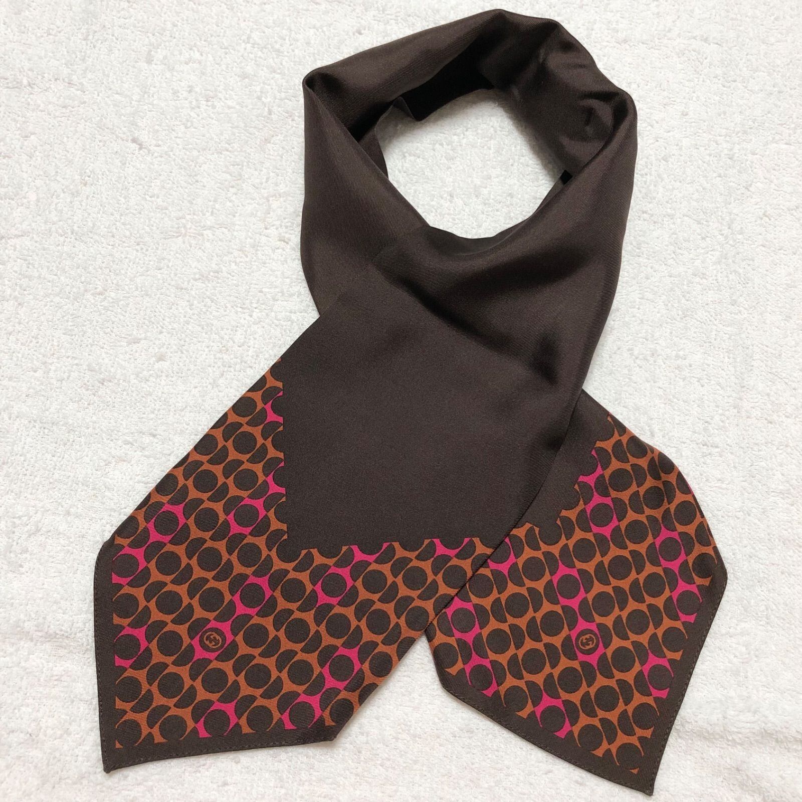 ■極美品■GUCCI グッチ シルクスカーフ ネックボウ ツイリー インターロッキングG ブラウン×オレンジ×ピンク イタリア製 レディース タグあり