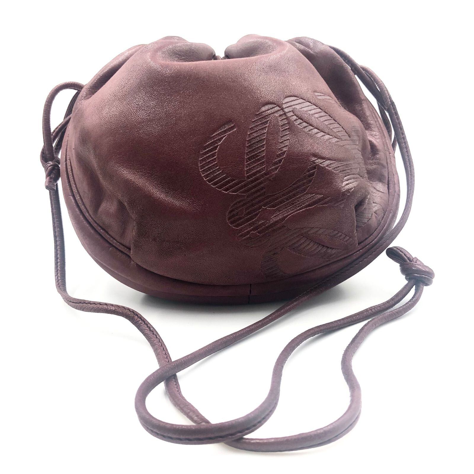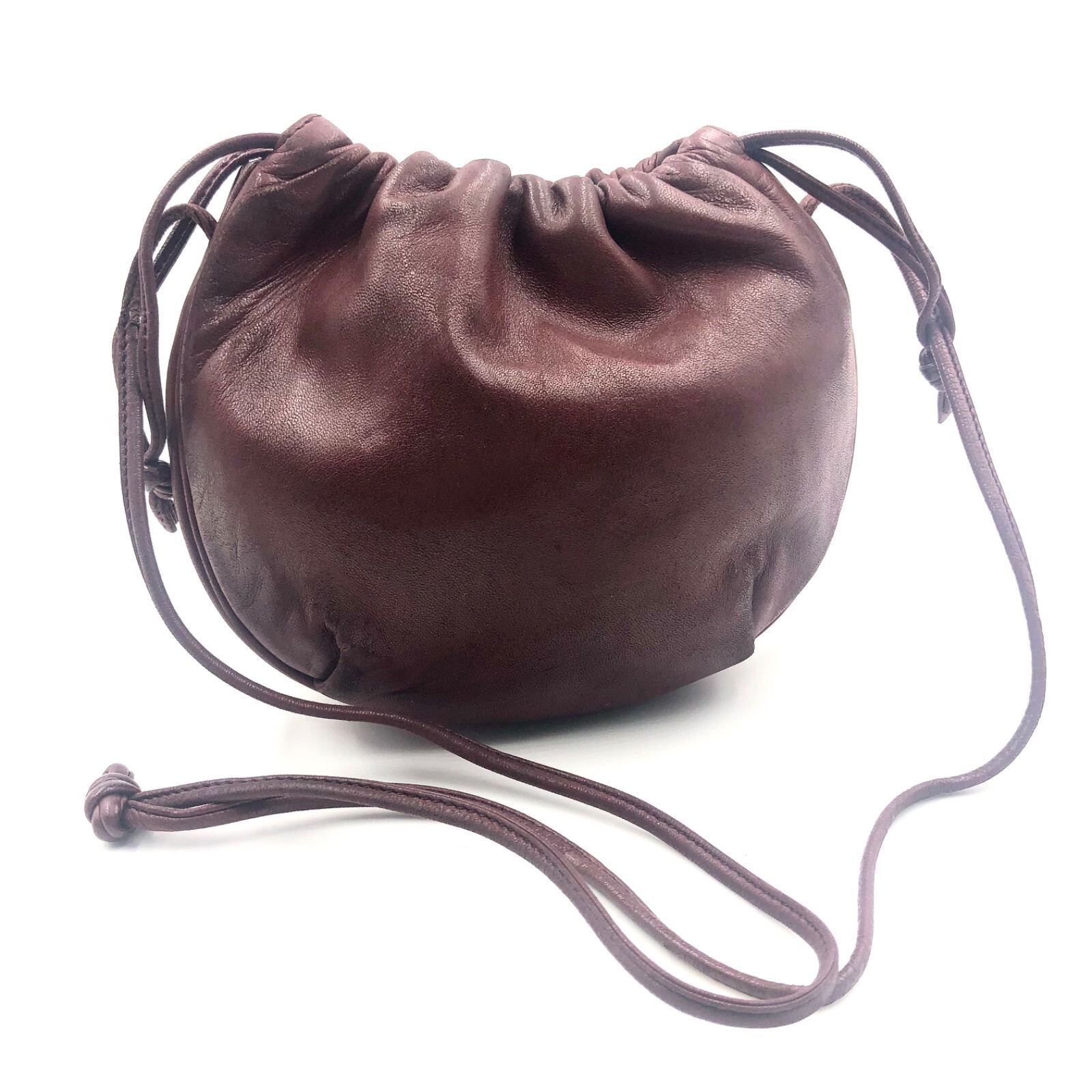 ■外観美品■LOEWE ロエベ アナグラム型押し 巾着ショルダーバッグ ナッパレザー 本革 ボルドー ゴールド金具 スペイン製 レディース