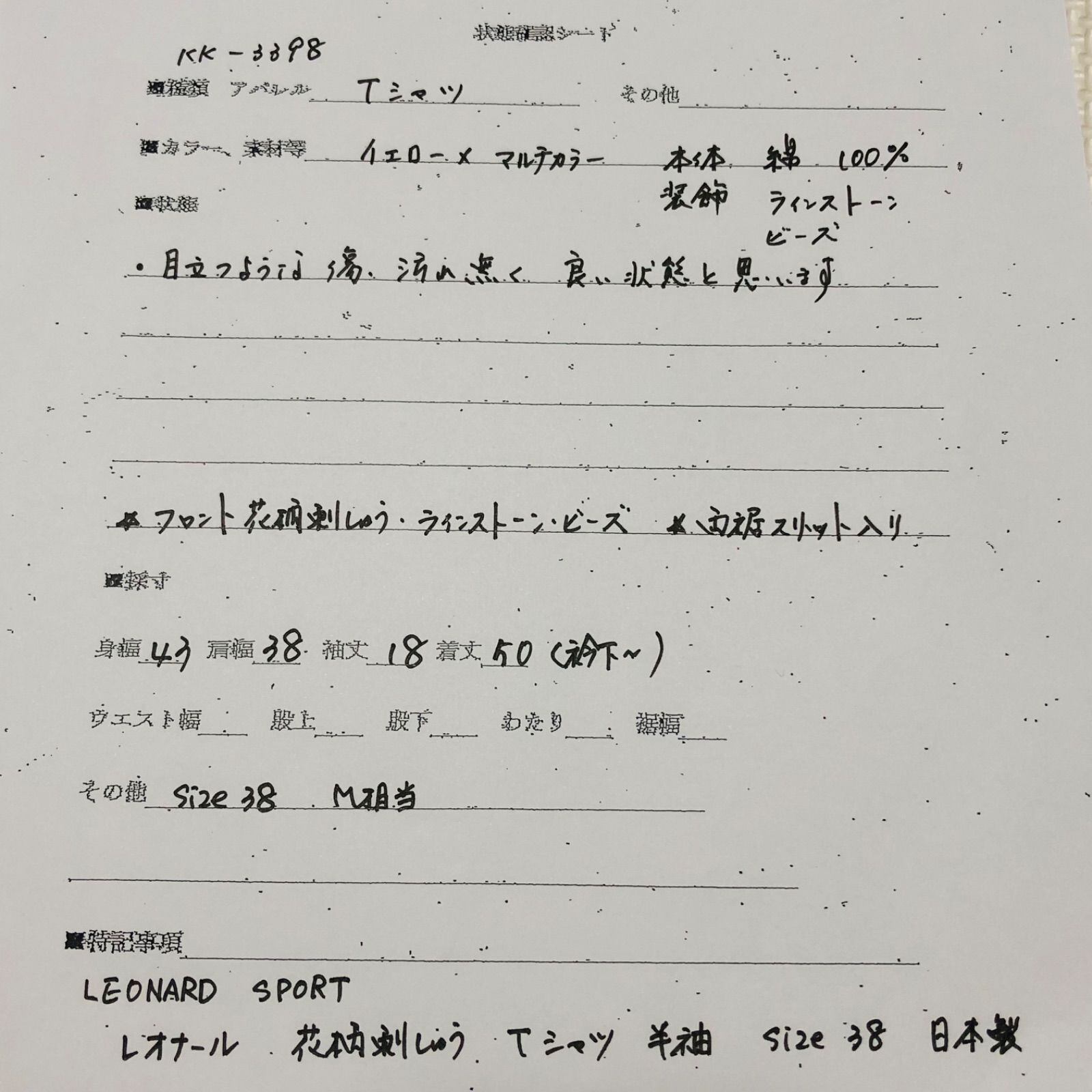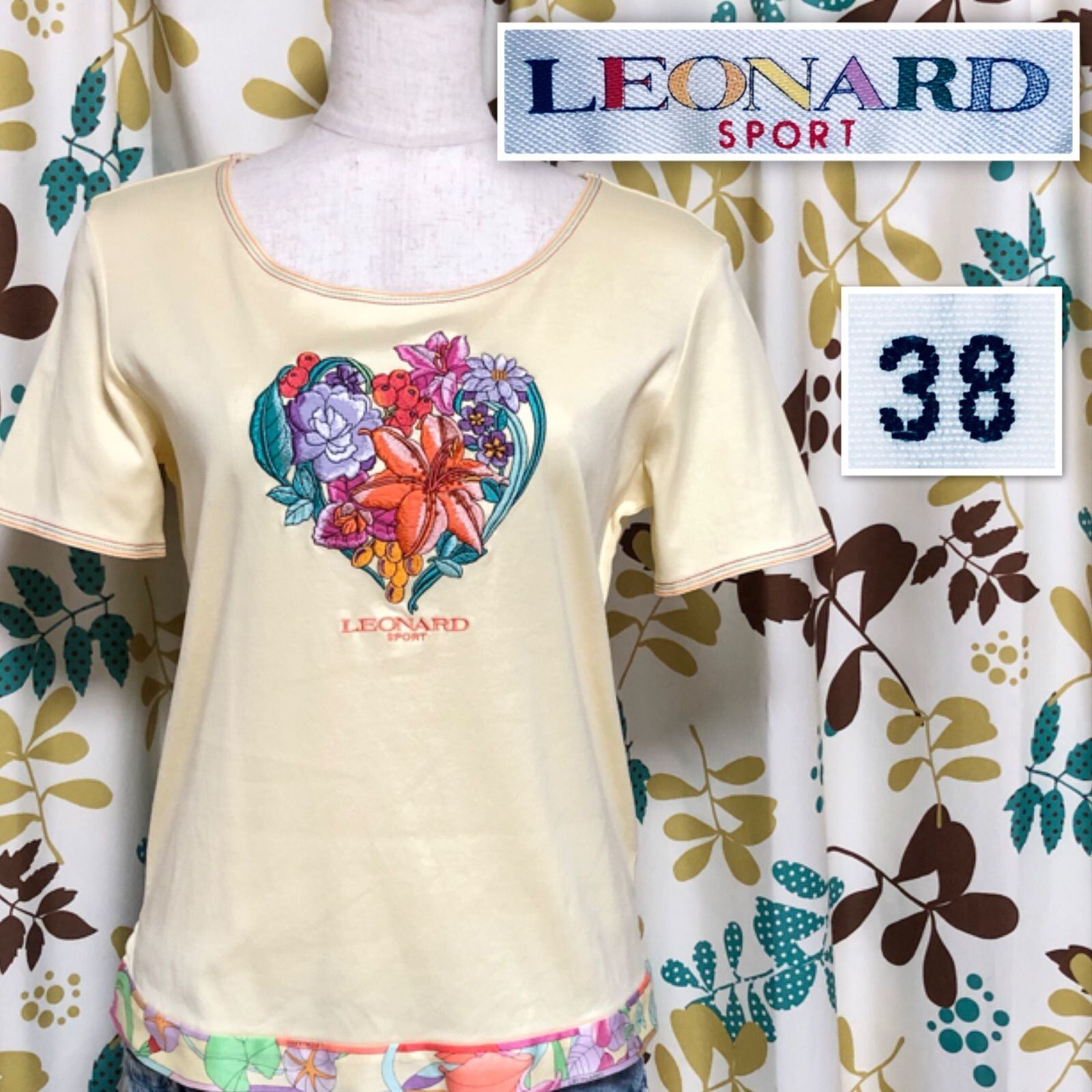 ■極美品■LEONARD SPORT レオナールスポーツ 半袖Tシャツ ハートの花柄刺しゅう ラインストーン ビーズ size38(サイズM) 日本製 コットン100% イエロー×マルチカラー レディース