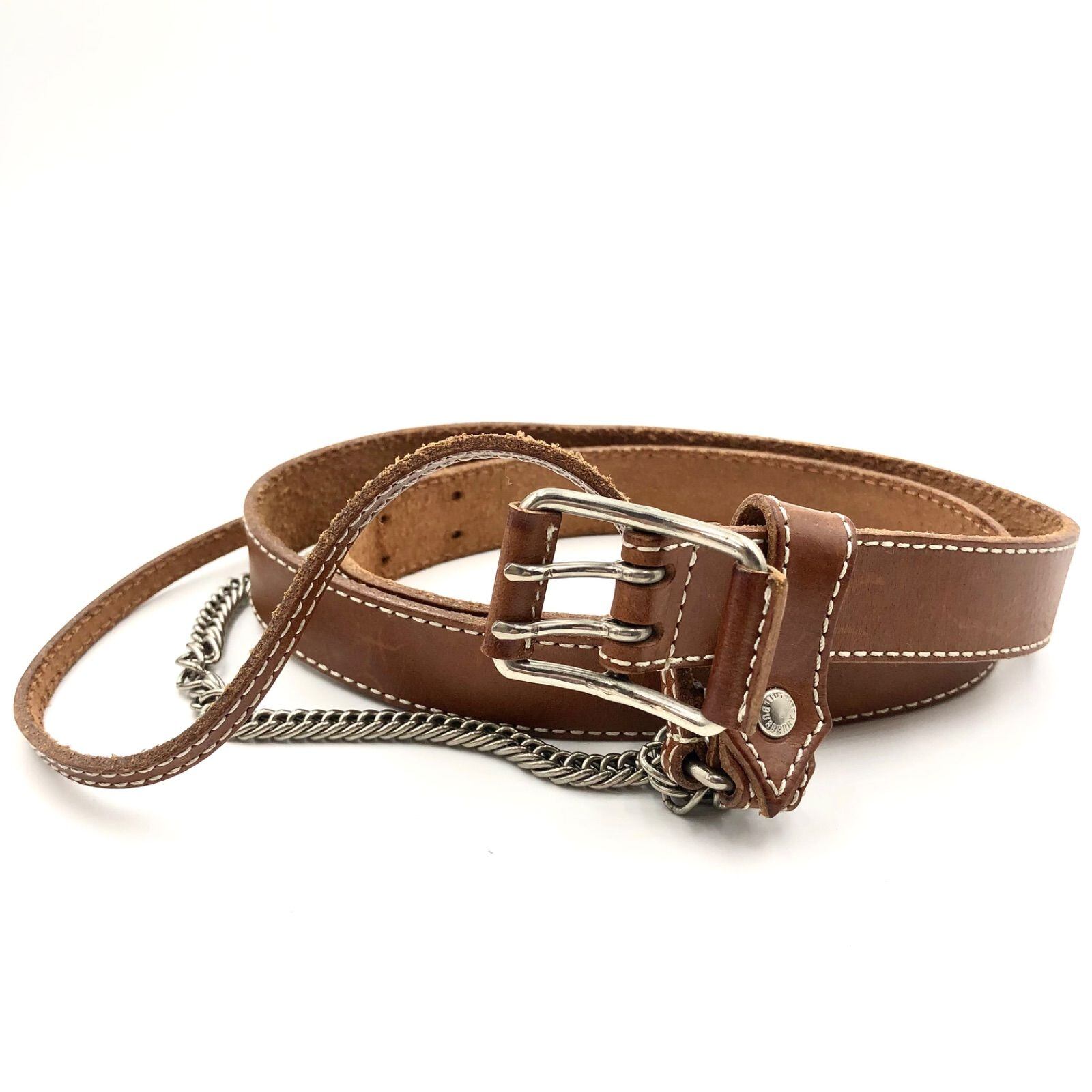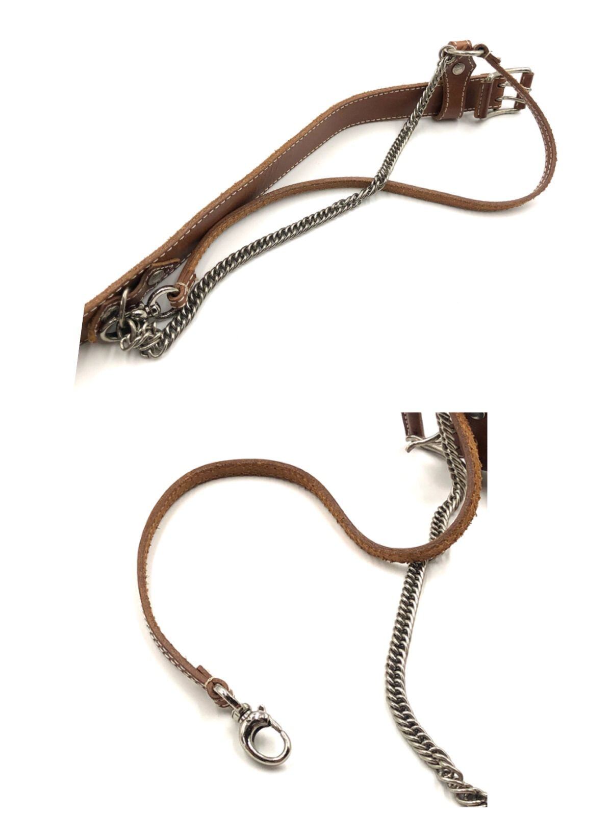 ■美品■BURBERRY BLUE LABEL バーバリーブルーレーベル レザーベルト チェーンストラップ+レザーストラップ付き ブラウン シルバー金具 ホースマーク メンズ ウエスト最大86.5cm