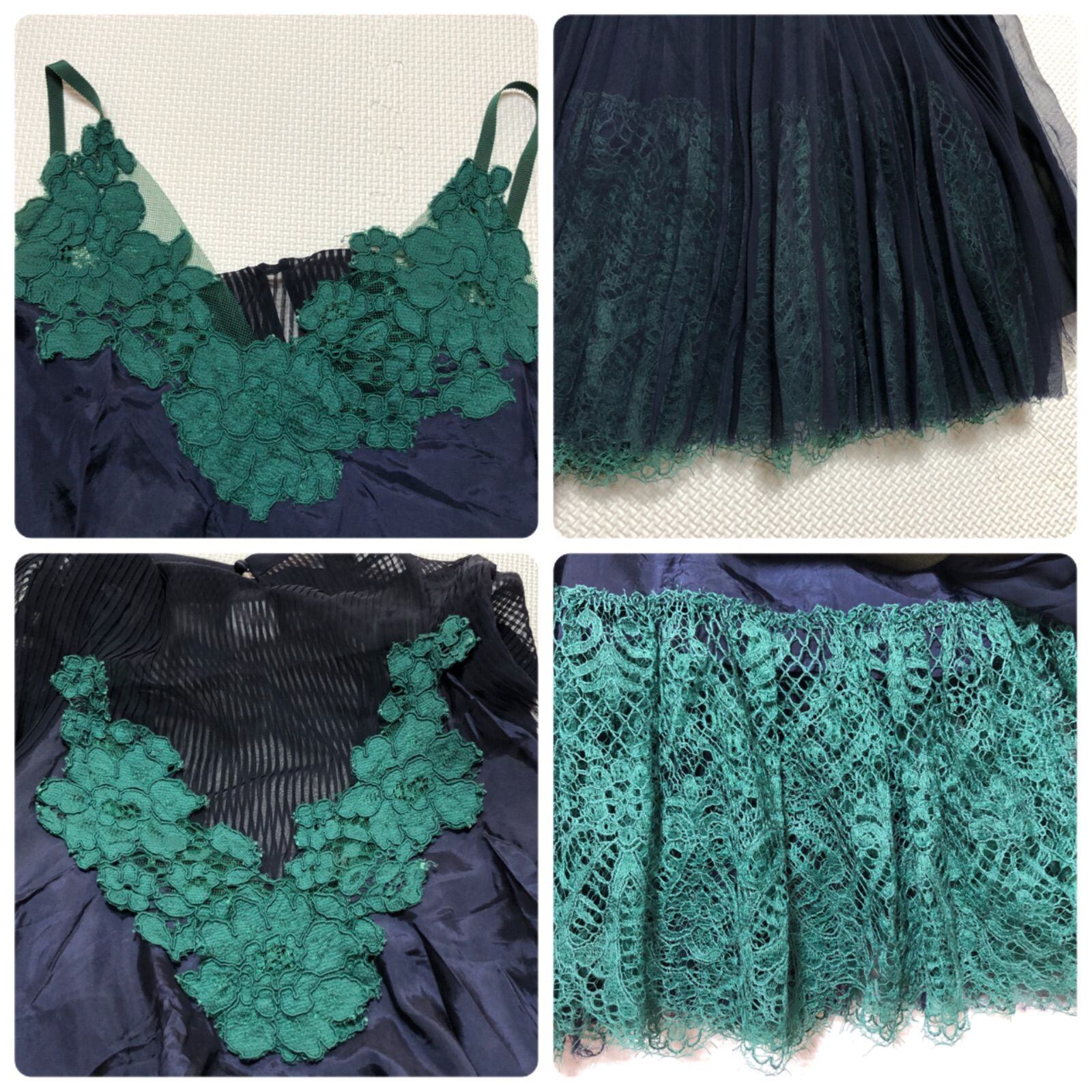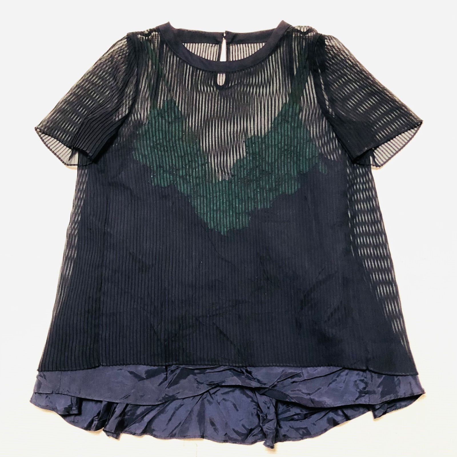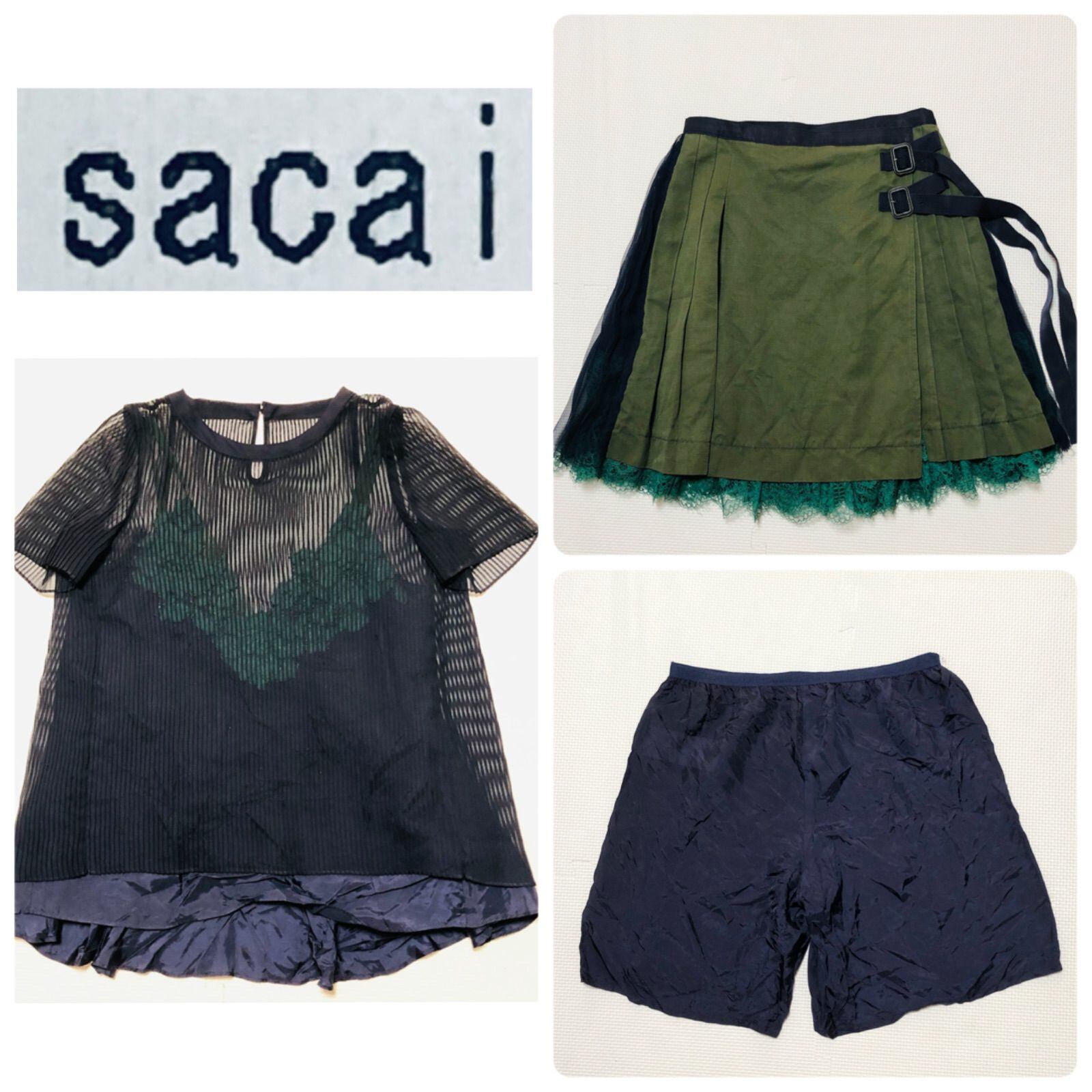 ■美品■SACAI サカイ 3点セットアップ トップス+ラップスカート+ペチパンツ プリーツ レース size2(サイズM相当) 日本製 透け感 ウエスト総ゴム レディース ネイビー×グリーン