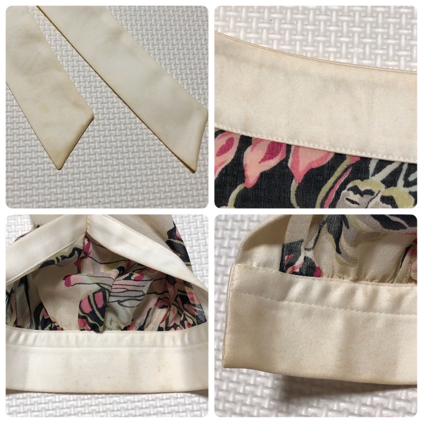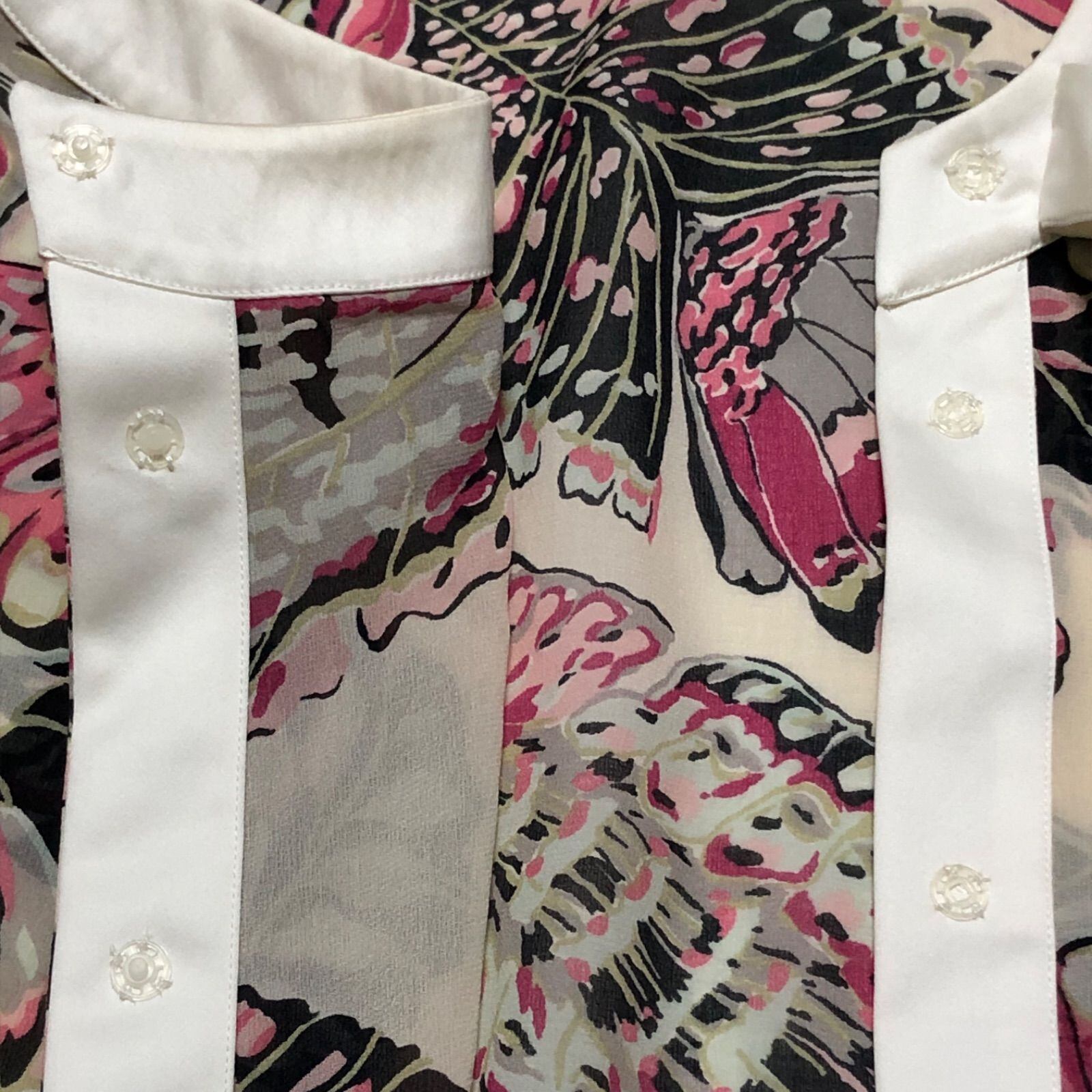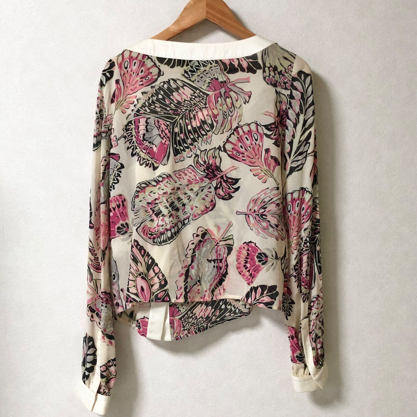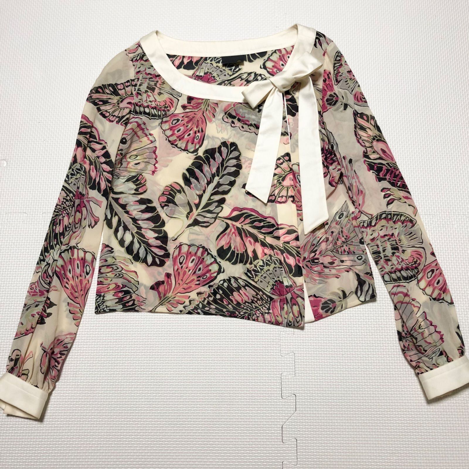 FENDI フェンディ シルクブラウス 半袖 羽根 フェザー総柄 イタリア製 リボンデザイン ベージュ×ピンク×ブラック等 サイズM~L レディース