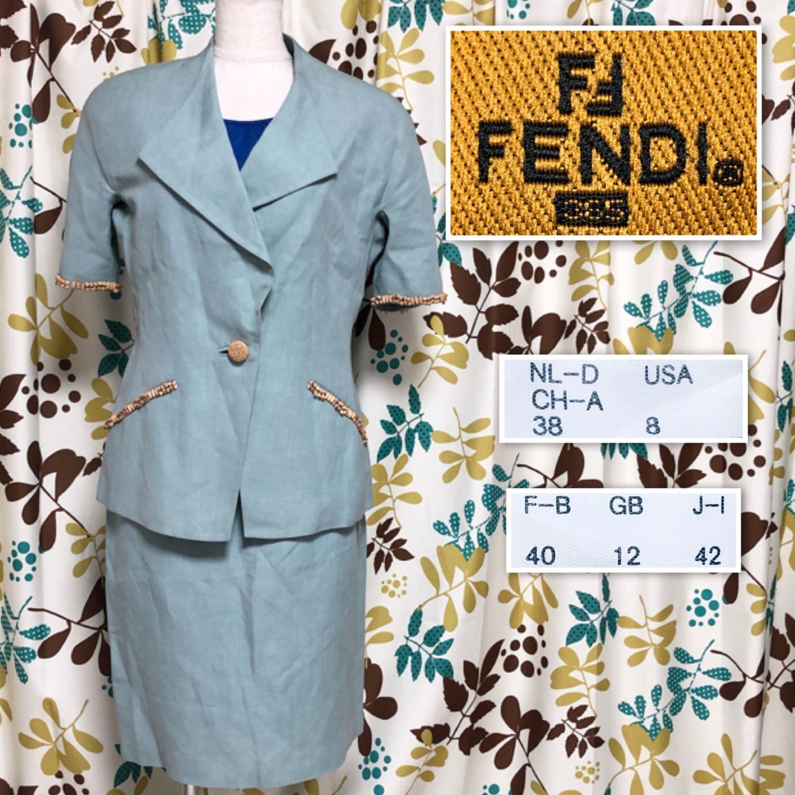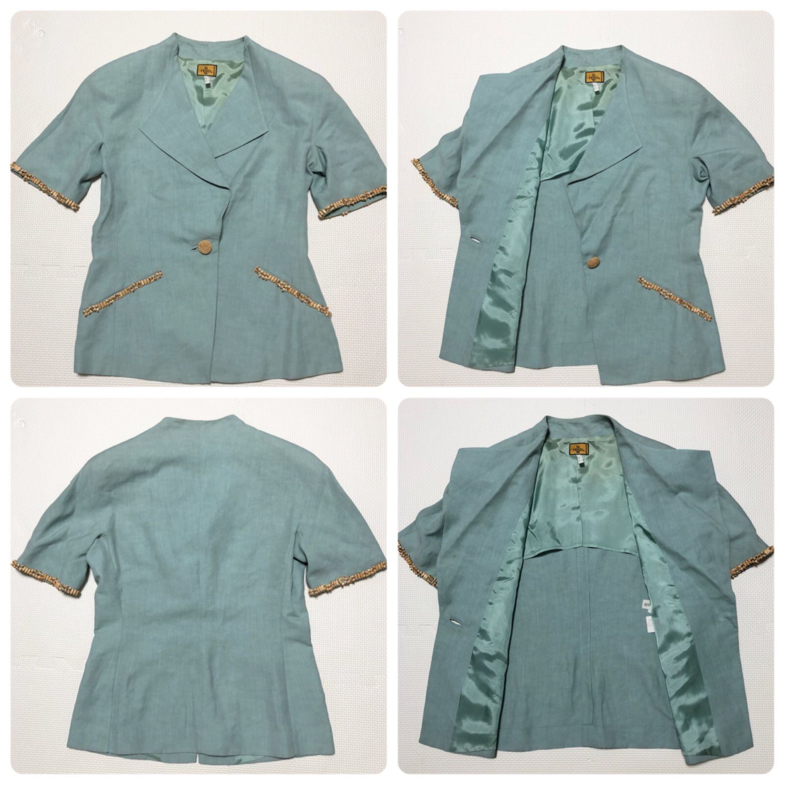 FENDI フェンディ ウッドビーズ飾り付き スカートスーツ上下セットアップ リネン混ビスコース 半袖シングルジャケット 1つボタン ひざ丈タイトスカート イタリア製 ミントグリーン 肩パッド レディース サイズM相当