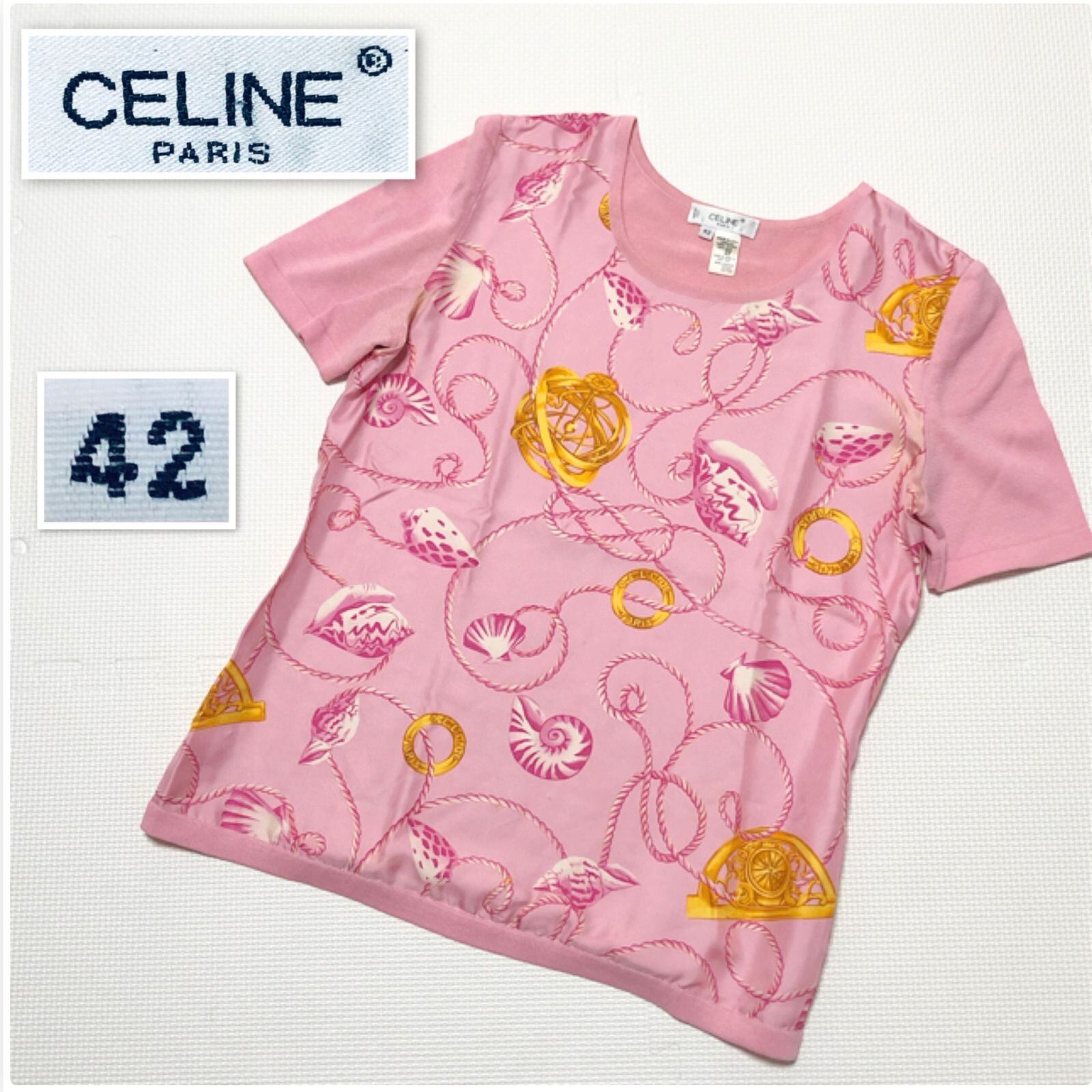 CELINE セリーヌ シルクプリントニット切り替え Tシャツ 半袖 貝殻 紐 黄金装飾 総柄 ピンク系 size42(サイズXL、LL) イタリア製 シルク×コットン レディース