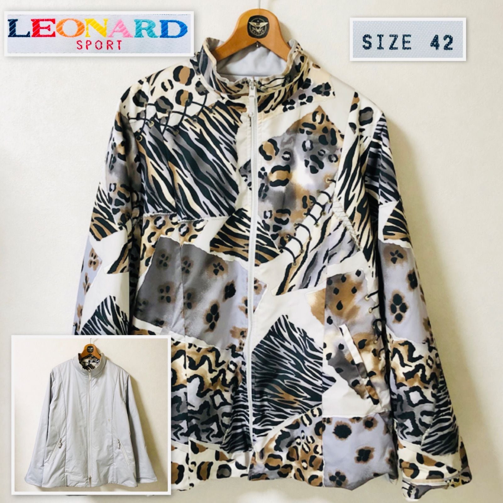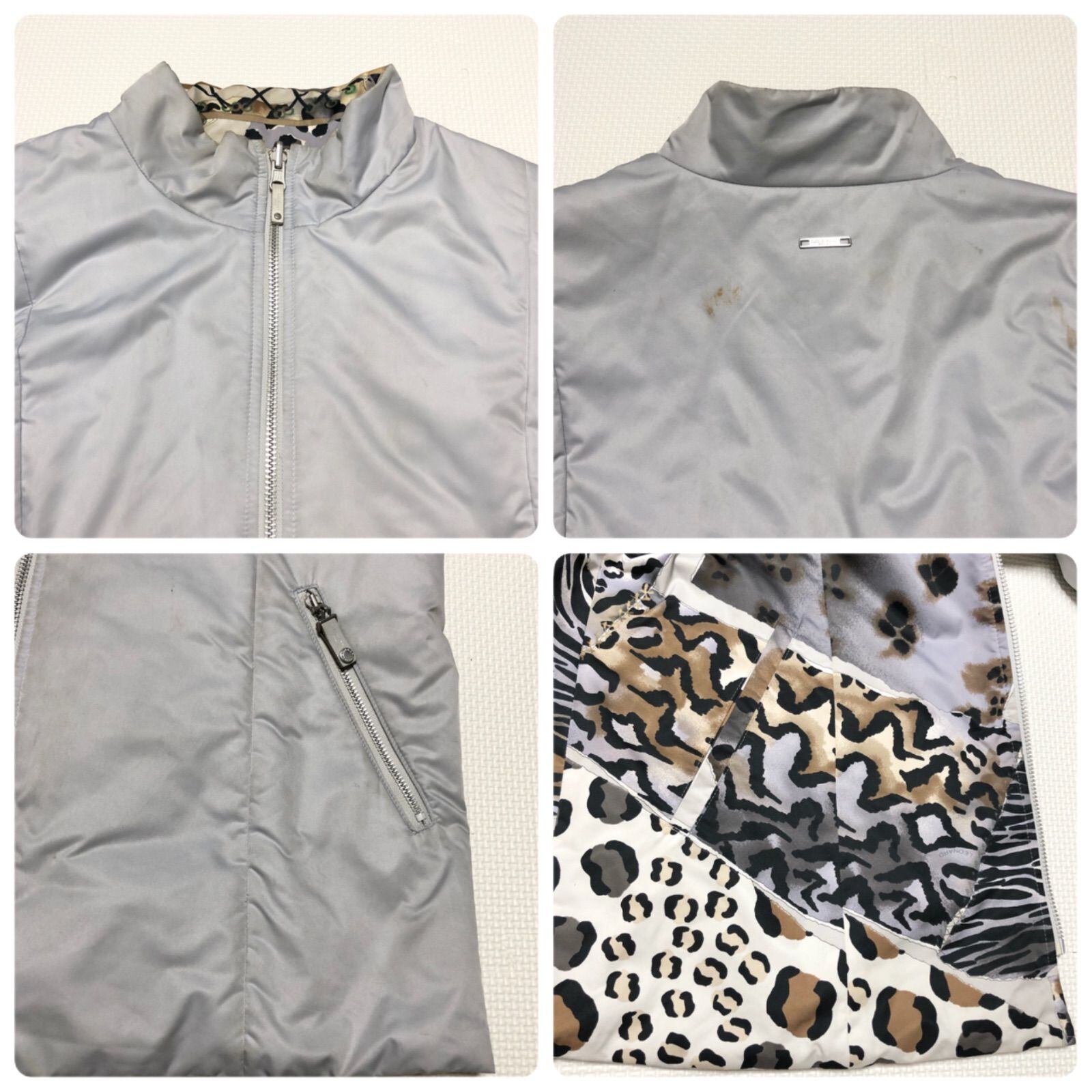 ■柄面美品■希少デザイン■LEONARD SPORT レオナールスポーツ 2way 中綿リバーシブルジャケット ブルゾン ネコ科アニマル柄×グレー系 size42(サイズXL相当) ビッグサイズ ポリエステル100% 日本製 レディース