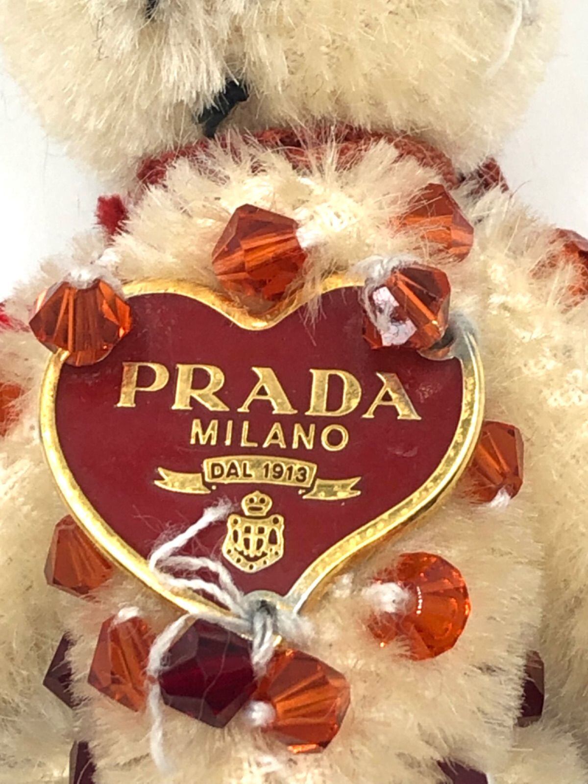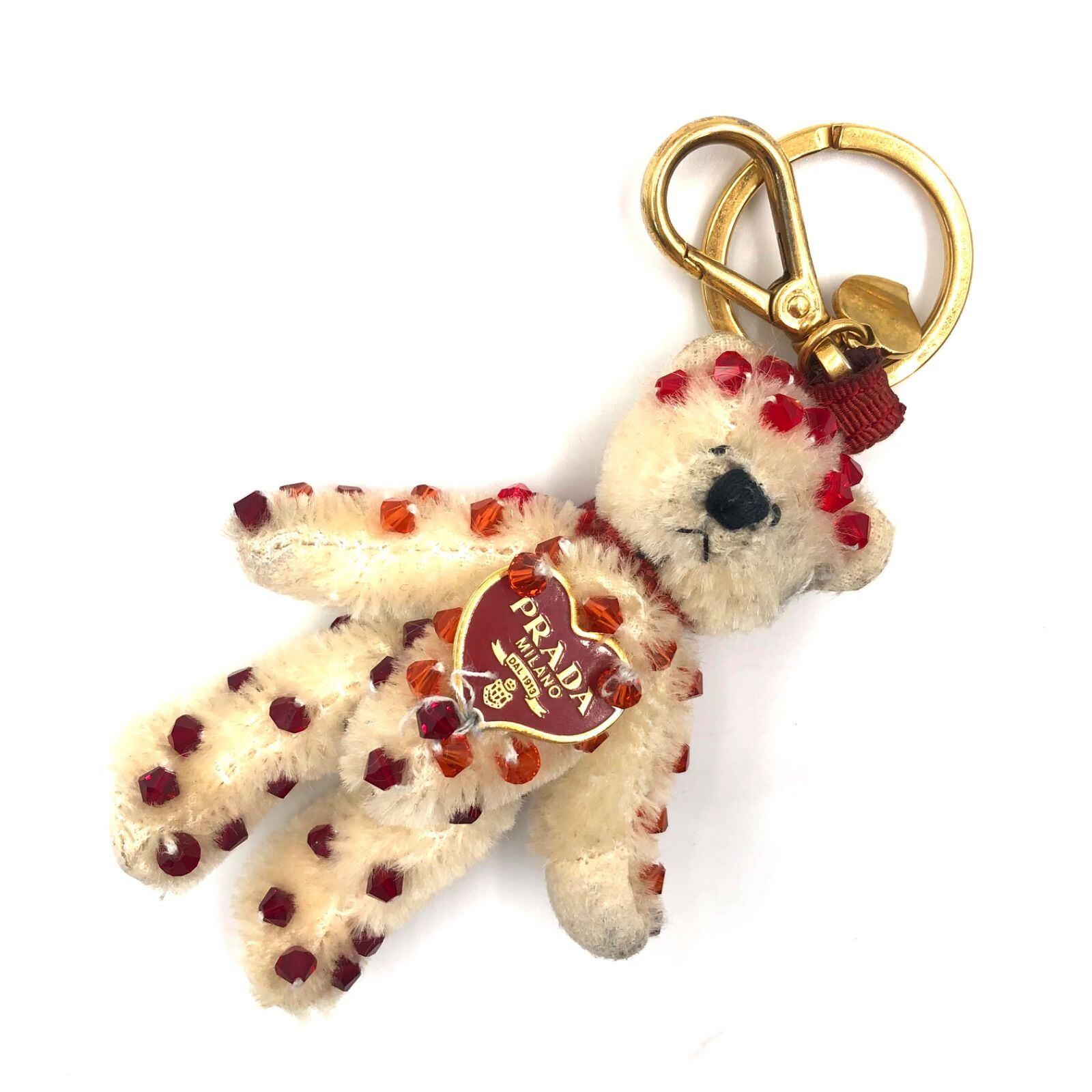 ■希少■PRADA プラダ ベア クマ キーホルダーチャーム ハート型ロゴプレート ビジュー ビーズ飾り ベージュアイボリー系 レッド ゴールド金具 キーリング レディース