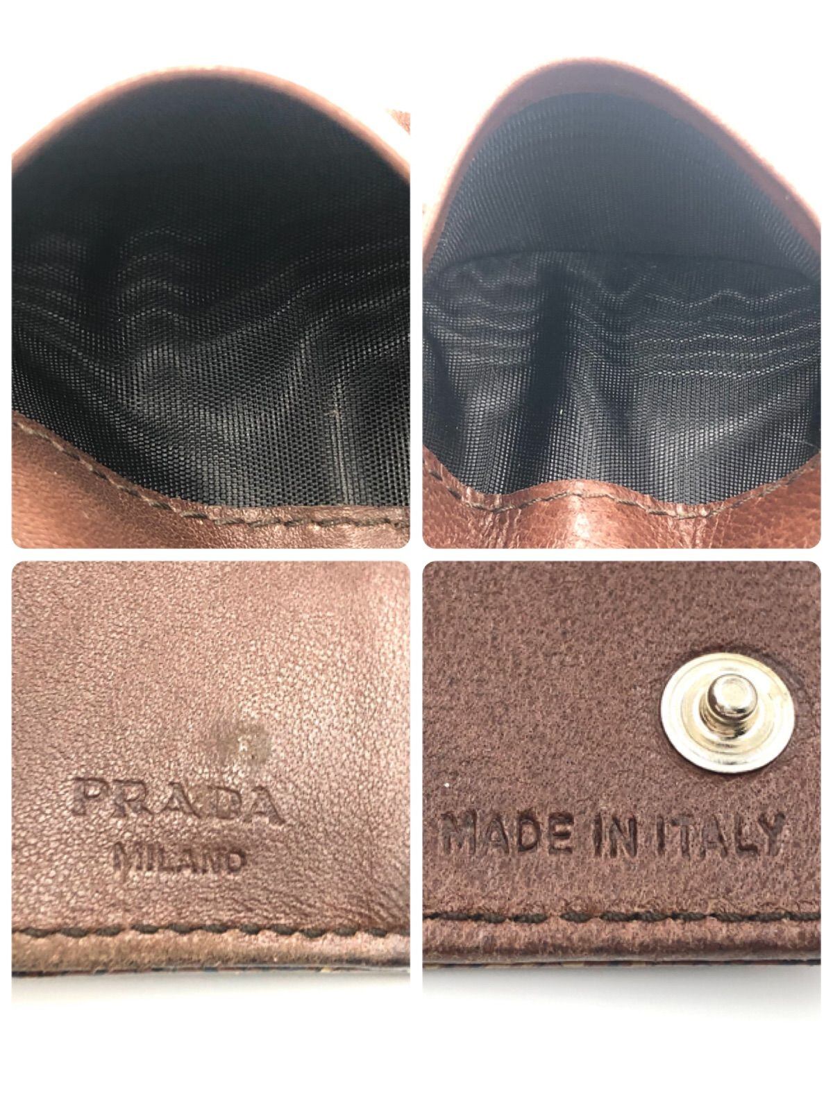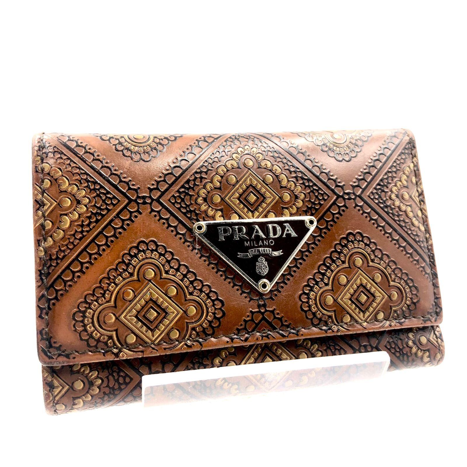 ■良品■超希少■PRADA プラダ PRINT CHIC エンボス加工レザー アンティーク家具風 キーケース 三角プレート カラー:コニャック・セーナップ(ブラウン系) シルバー金具 イタリア製