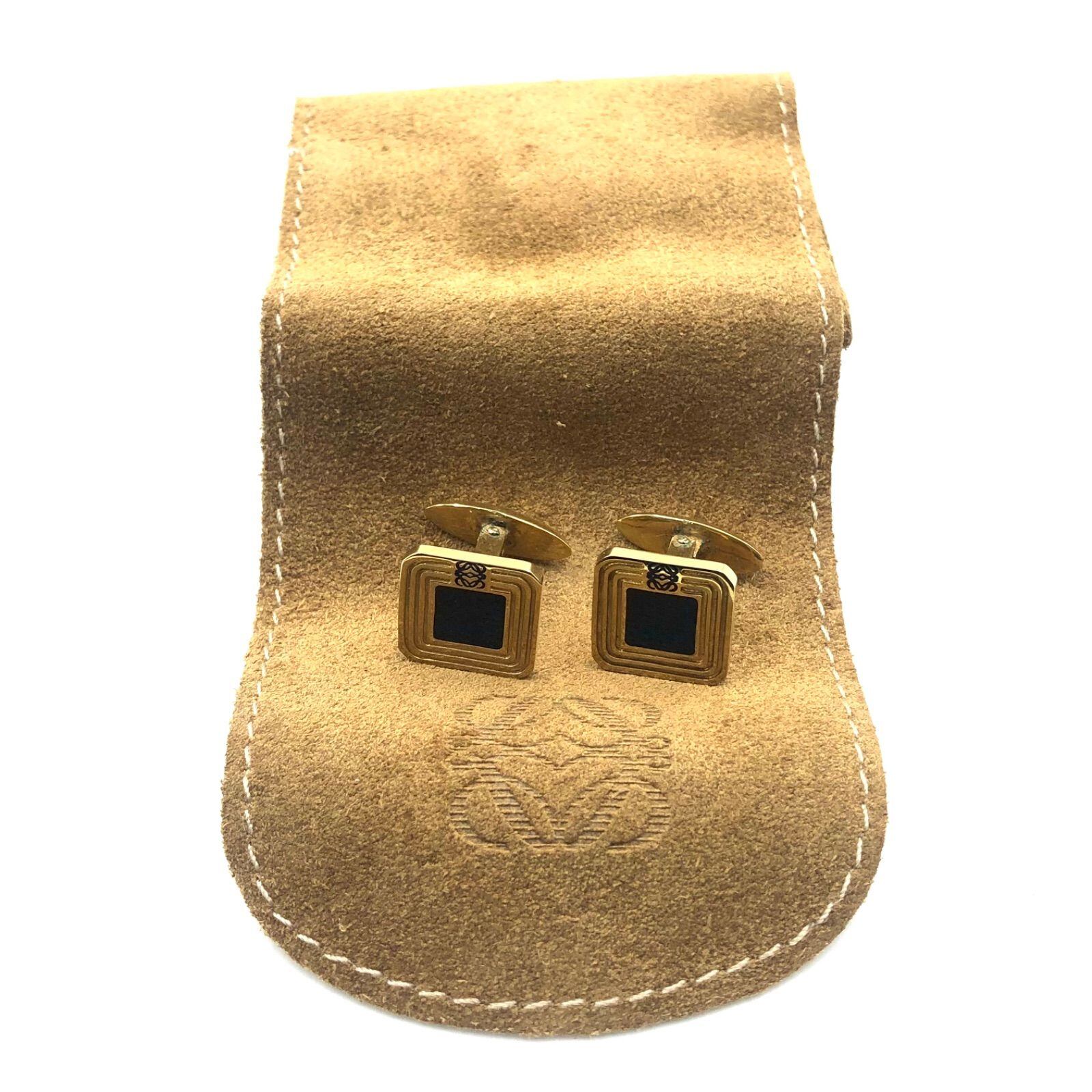 ■美品■LOEWE ロエベ アナグラム カフスボタン カフリンクス スクエア型 アナグラム型押しスエードレザーケース付き スペイン製 ゴールド×ブラック メンズアクセサリー