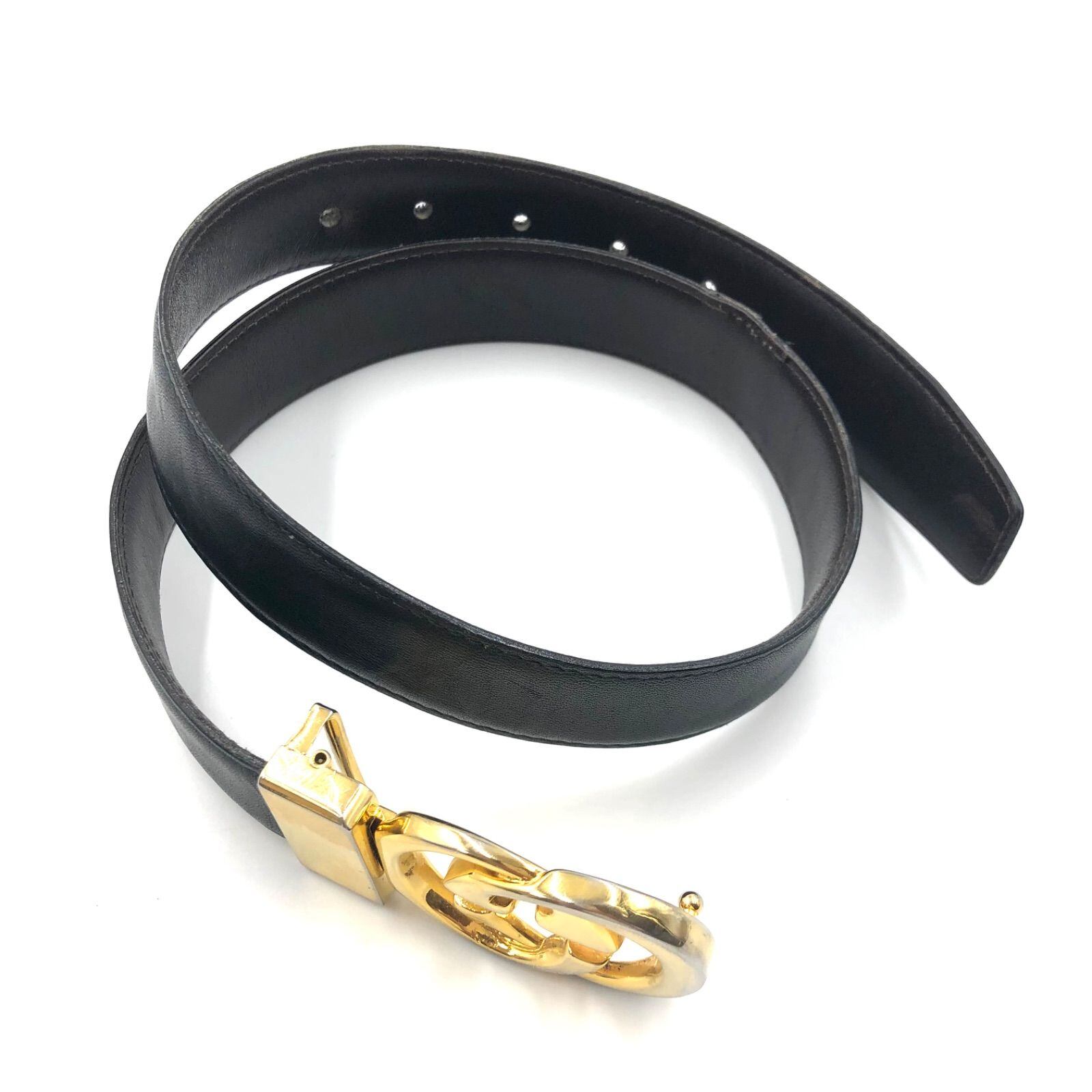 GUCCI グッチ インターロッキングG ベルトバックル+社外レザーベルト付き ゴールド金具 ブラック×ダークブラウン イタリア製 金具パテント刻印 レディース ウエスト最大64.5cm