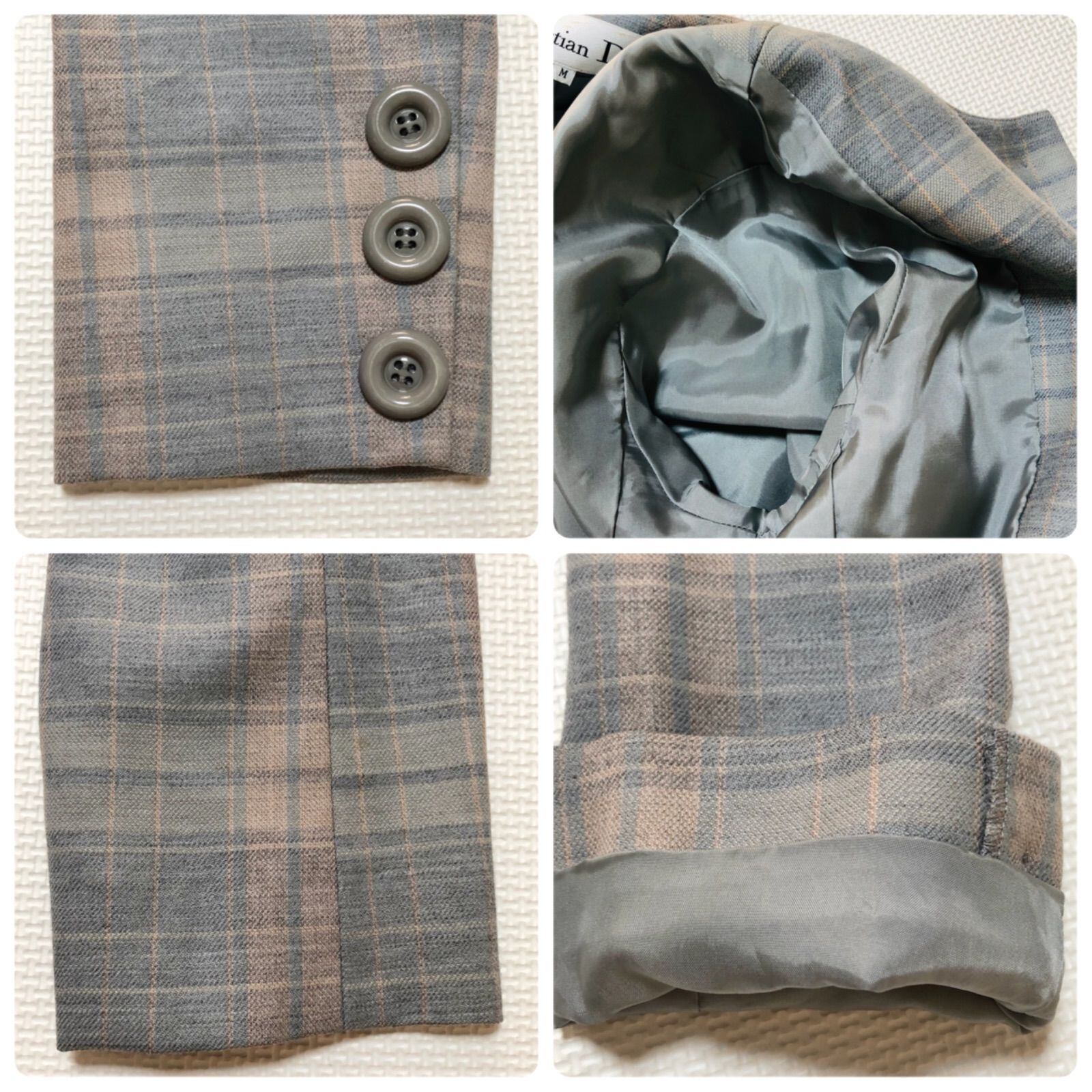 Christian Dior クリスチャンディオール ノーカラージャケット シングル6つボタン比翼仕立て ウール100% チェック総柄 sizeM 肩パッド 裏地あり レディース