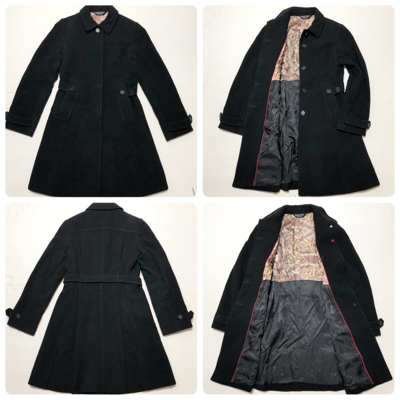 Paul Smith BLACKLABEL ポールスミスブラックレーベル ベルト付きステンカラーコート ウール87% size40(L) オンワード樫山 ブラック×裏地コイン柄 シングル レディース