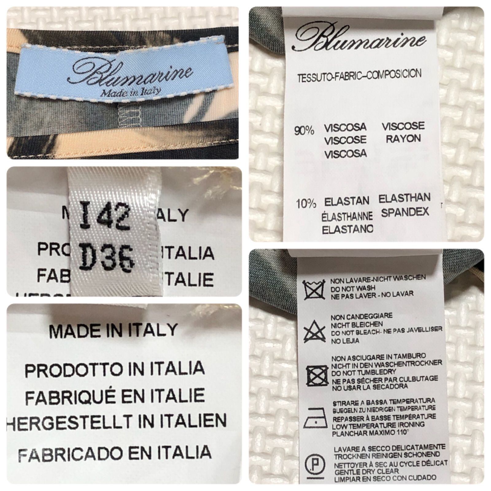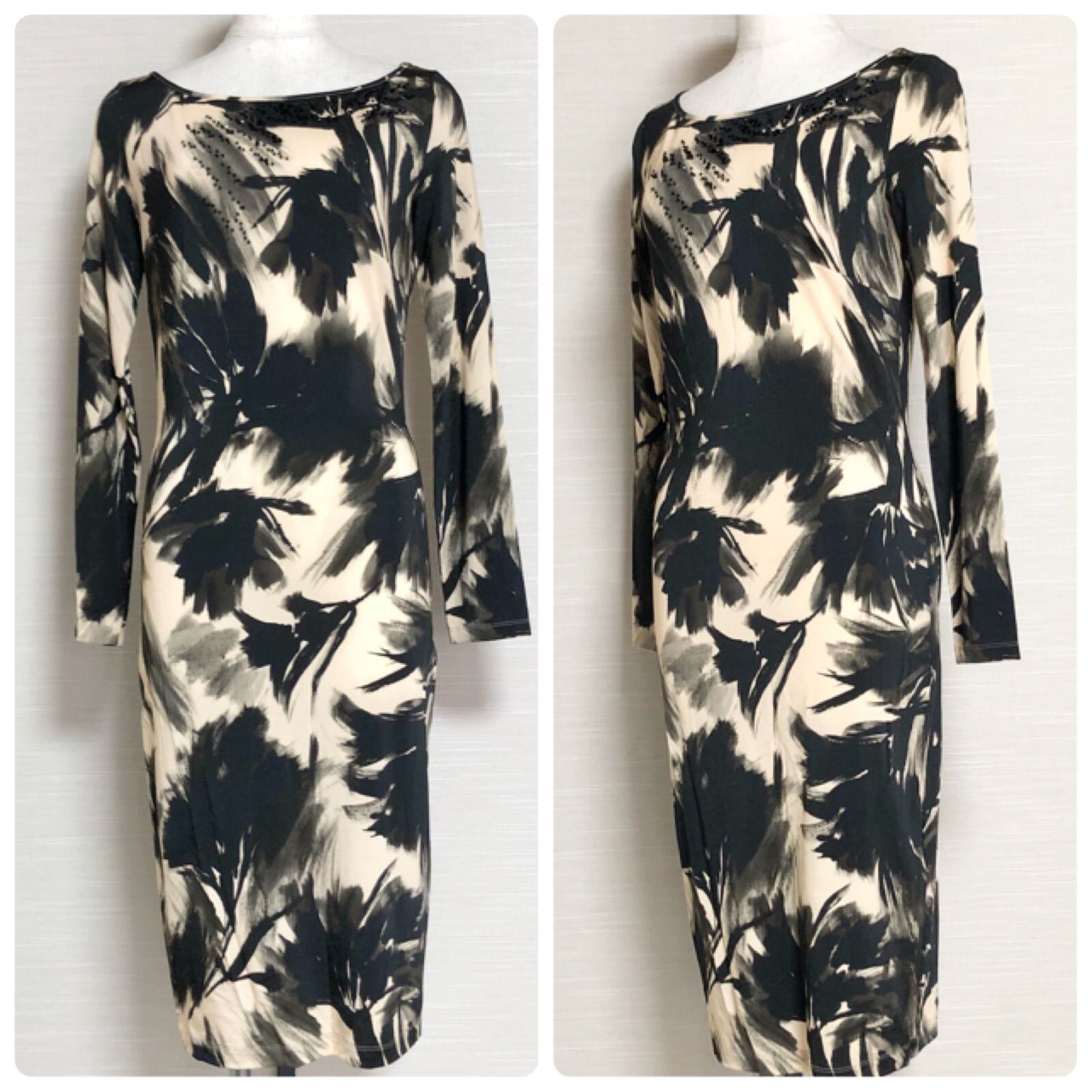 ■極美品■Blumarine ブルマリン ビジュー装飾付き ボディコンシャスワンピース 長袖 花柄 ボタニカル 総柄 ベージュ×ブラック イタリア製 イタリアサイズ42(M) 伸縮性あり ストレッチ素材 レディース