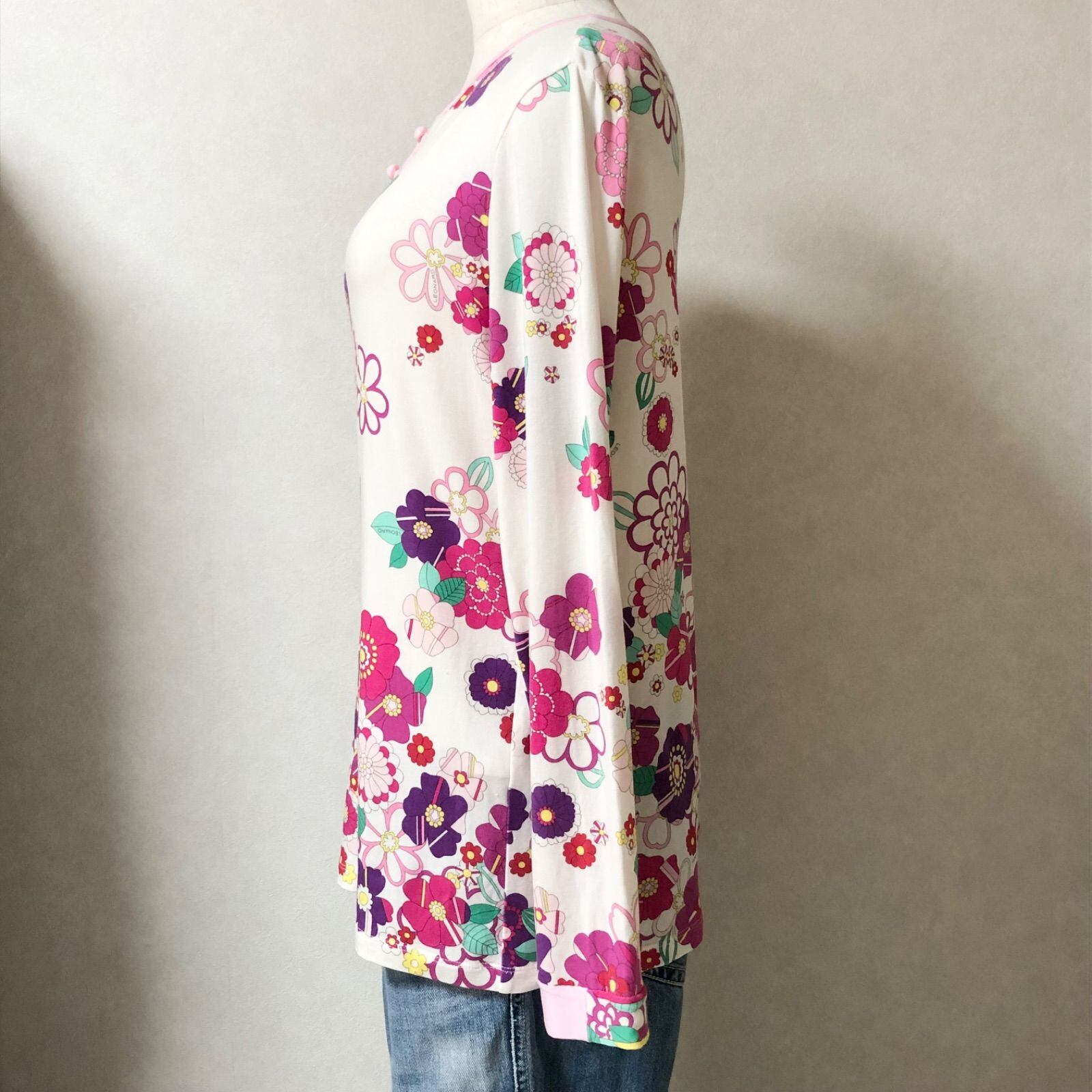LEONARD SPORT レオナールスポーツ ヘンリーネックカットソー 花柄プリント 総柄 長袖 size40(サイズL) 日本製 ストレッチ素材 伸縮性あり アイボリー×マルチカラー レディース