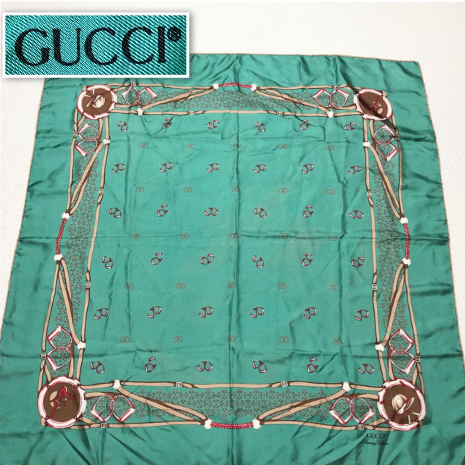 GUCCI グッチ 大判スカーフ 88cm×85cm ホースビット あぶみ インターロッキングG 総柄 シルク100% イタリア製 エメラルドグリーン タグあり