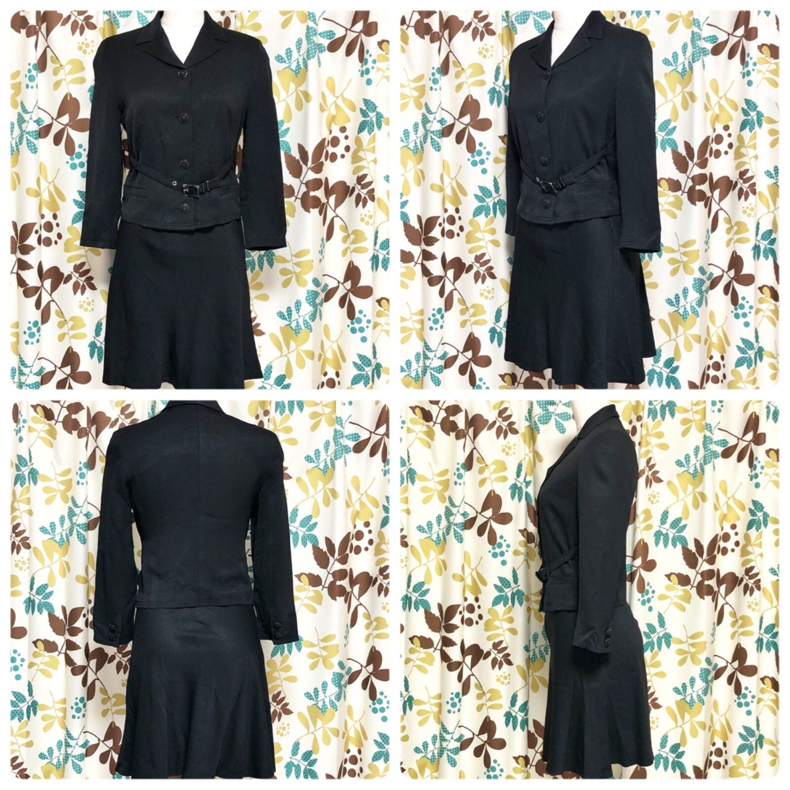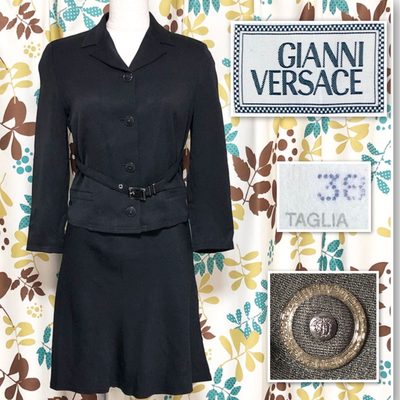 GIANNI VERSACE ジャンニヴェルサーチ スカートスーツセットアップ ’90sバブル期 size38(M) イタリア製 ブラック ベルテッド ベルト メデューサ ギリシア雷文 レディース