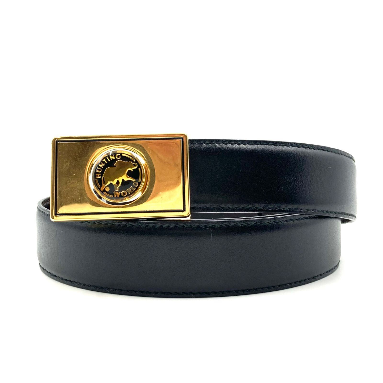 ■未使用品■Hunting World ハンティングワールド リバーシブル レザーベルト ロゴバックル ブラック×ダークブラウン ゴールド金具 イタリア製 ウエスト93?103cm メンズ ビッグサイズ