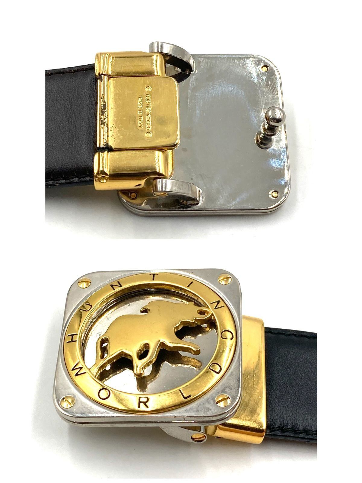 ■未使用品■Hunting World ハンティングワールド リバーシブル レザーベルト ロゴバックル ブラック×ダークブラウン ゴールド×シルバー金具 イタリア製 ウエスト98?108cm メンズ ビッグサイズ